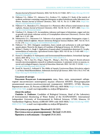 24. Solomonova E.A., Ostroumov S.A. Tolerance of an aquatic macrophyte Potamogeton crispus L. to sodium dodecyl sulphate // Moscow University Biological Sciences Bulletin. 2007. Vol. 62. No 4. P. 176-179. DOI: 10.3103/S0096392507040074