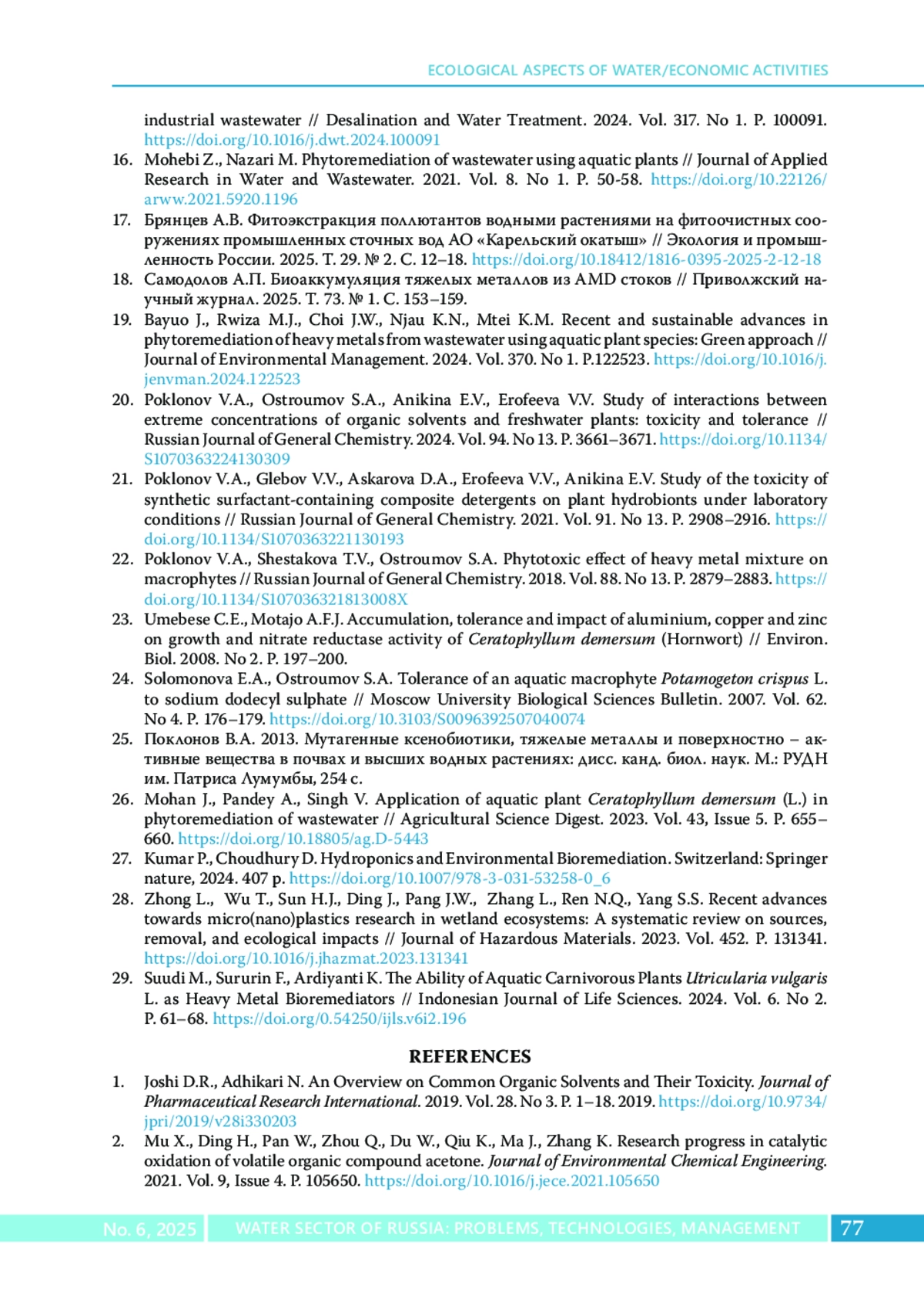 19. Вауио А.А, Rwiza M.J., Choi J.W., Njau K.N., Mtei K.M. Recent and sustainable advances in phytoremediation of heavy metals from wastewater using aquatic plant species: Green approach // Journal of Environmental Management. 2024. Vol. 370. No 1. P.122523. DOI: 10.1016/j.jenvman.2024.122523