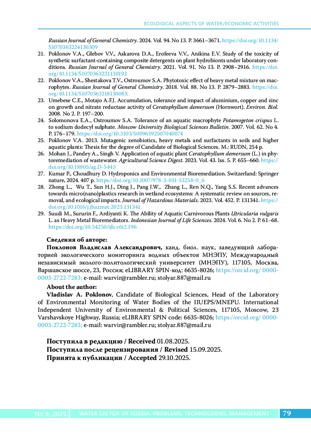 25. Поклонов B.A. 2013. Мутагенные ксенобиотики, тяжелые металлы и поверхностно - активные вещества в почвах и высших водных растениях: дисс. канд. биол. наук. М.: РУДН им. Патриса Лумумбы, 254 с.