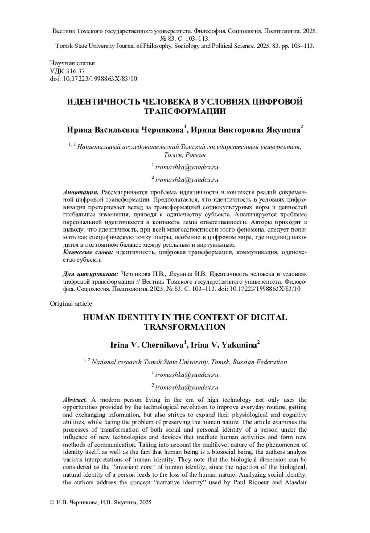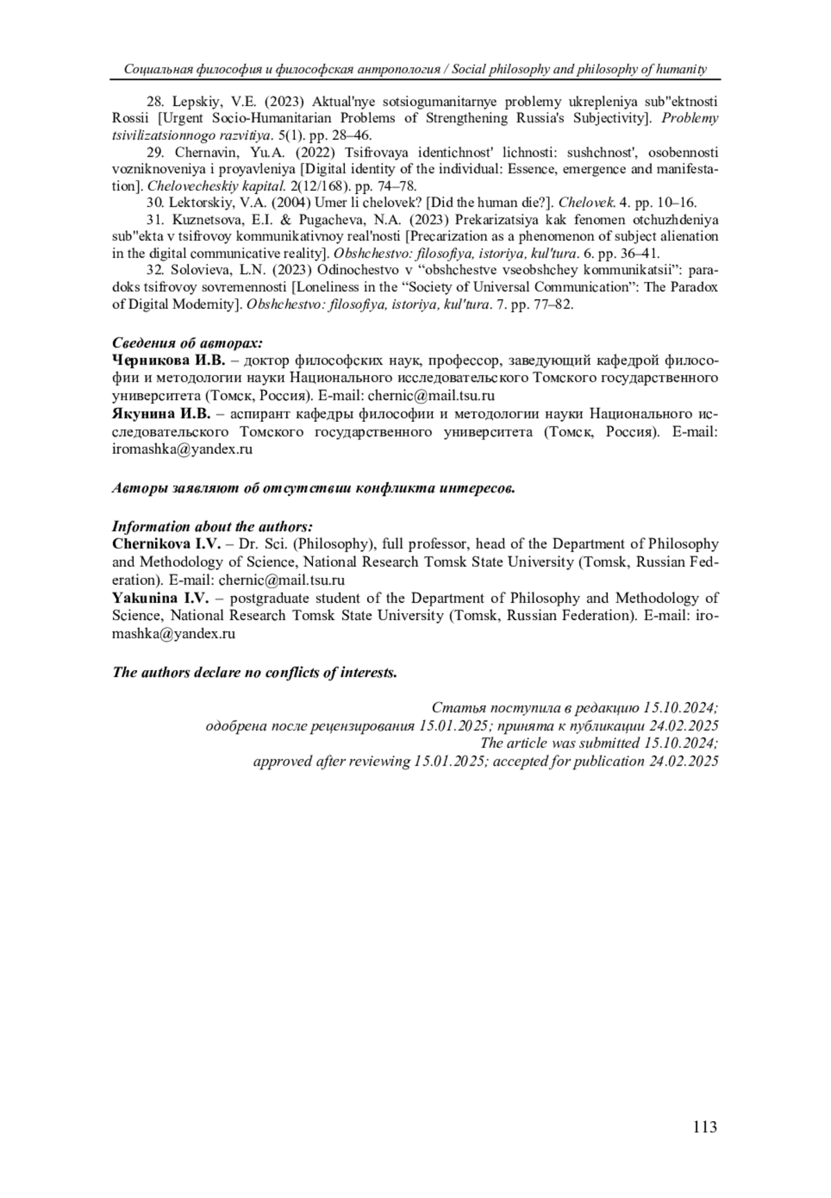 Авторы приходят к выводу, что идентичность, при всей многоаспектности этого феномена, следует понимать как специфическую точку опоры, особенно в цифровом мире, где индивид находится в постоянном балансе между реальным и виртуальным. Авторы заявляют об отсутствии конфликта интересов.
