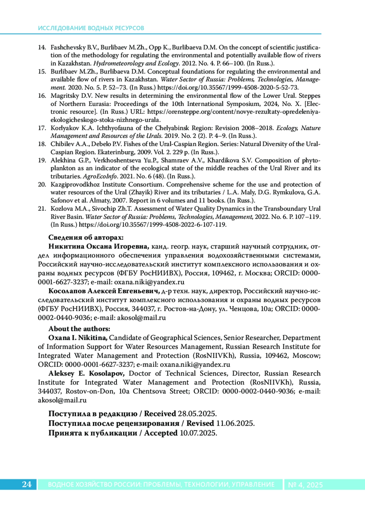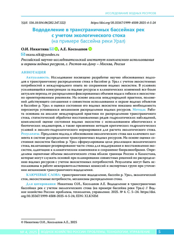 21. Козлова М.А., Сивохип Ж.Т. Оценка динамики качества воды трансграничного бассейна реки Урал // Водное хозяйство России: проблемы, технологии, управление. 2022. № 6. С. 107-119.