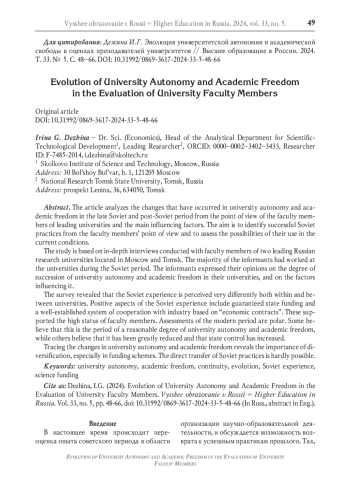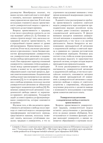 Вопросы преемственности и традиции, в том числе в российском контексте, до сих пор вызывают дебаты [1; 2]. Основная полемика строится вокруг того, насколько непрерывной является преемственность, что в определённой степени зависит от уровня абстрагирования. Преемственность многоаспектна. В том числе, она может рассматриваться в преломлении к таким базовым ценностям функционирования университетов, как университетская автономия и академическая свобода преподавателей и исследователей.