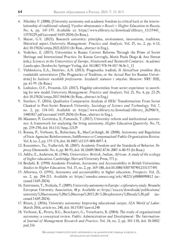 20. Bain O. University Autonomy from the Top Down: Lessons from Russia // International Higher Education. 2002. No. 27. P. 22-24. DOI: 10.6017/ihe.2002.27.6972