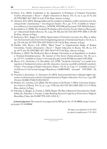 39. Dezhina I. The Publication Race in Russian Universities as an Impediment to Academic Freedom // Demokratizatsiya: The Journal of Post-Soviet Democratization. 2022. Vol. 30. No. 1. P. 135-157. URL: https://www.muse.jhu.edu/article/847106 (дата обращения: 14.05.2024). EDN: DLYFUX