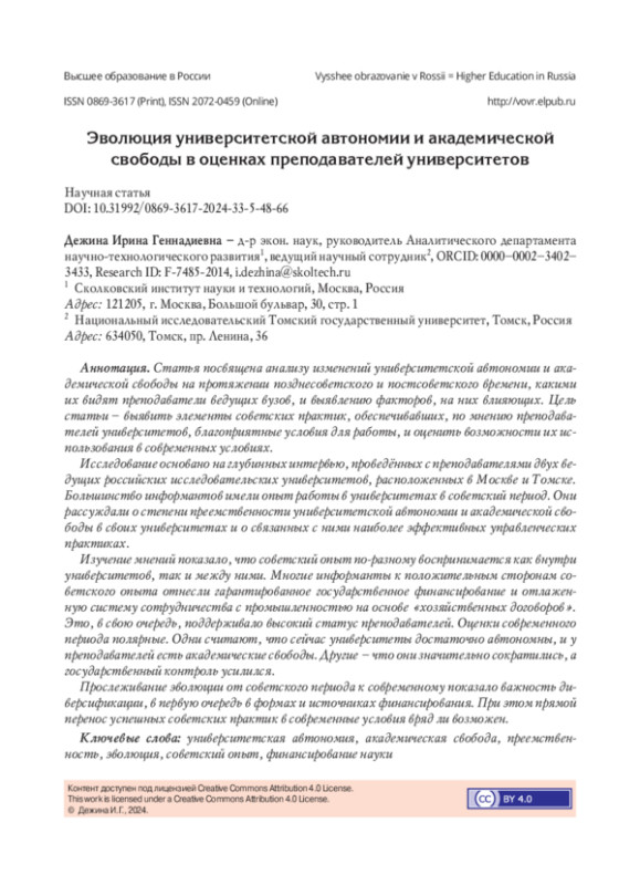Статья посвящена анализу изменений университетской автономии и академической свободы на протяжении позднесоветского и постсоветского времени, какими их видят преподаватели ведущих вузов, и выявлению факторов, на них влияющих. Цель статьи - выявить элементы советских практик, обеспечивавших, по мнению преподавателей университетов, благоприятные условия для работы, и оценить возможности их использования в современных условиях. Исследование основано на глубинных интервью, проведённых с преподавателями двух ведущих российских исследовательских университетов, расположенных в Москве и Томске. Большинство информантов имели опыт работы в университетах в советский период. Они рассуждали о степени преемственности университетской автономии и академической свободы в своих университетах и о связанных с ними наиболее эффективных управленческих практиках. Изучение мнений показало, что советский опыт по-разному воспринимается как внутри университетов, так и между ними. Многие информанты к положительным сторонам советского опыта отнесли гарантированное государственное финансирование и отлаженную систему сотрудничества с промышленностью на основе «хозяйственных договоров». Это, в свою очередь, поддерживало высокий статус преподавателей. Оценки современного периода полярные. Одни считают, что сейчас университеты достаточно автономны, и у преподавателей есть академические свободы. Другие - что они значительно сократились, а государственный контроль усилился. Прослеживание эволюции от советского периода к современному показало важность диверсификации, в первую очередь в формах и источниках финансирования. При этом прямой перенос успешных советских практик в современные условия вряд ли возможен.