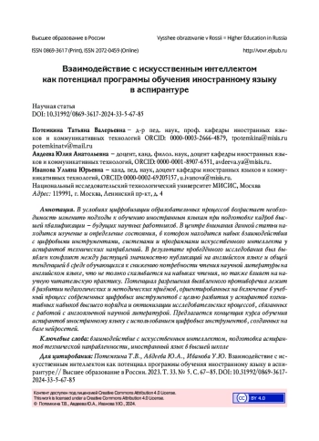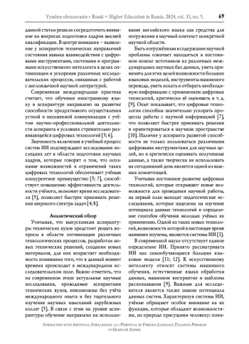 В условиях цифровизации образовательных процессов возрастает необходимость изменить подходы к обучению иностранным языкам при подготовке кадров высшей квалификации - будущих научных работников. В центре внимания данной статьи находится изучение и определение состояния, в котором находится навык взаимодействия с цифровыми инструментами, системами и программами искусственного интеллекта у аспирантов технических направлений. В результате проведённого исследования был выявлен конфликт между растущей значимостью публикаций на английском языке и общей тенденцией в среде обучающихся к снижению потребности чтения научной литературы на английском языке, что не только сказывается на навыках чтения, но также влияет на научную читательскую практику. Потенциал разрешения выявленного противоречия лежит в развитии педагогических и методических приёмов, ориентированных на включение в учебный процесс современных цифровых инструментов с целью развития у аспирантов когнитивных навыков высшего порядка и оптимизации исследовательских процессов, связанных с работой с англоязычной научной литературой. Предлагается концепция курса обучения аспирантов иностранному языку с использованием цифровых инструментов, созданных на базе нейросетей.