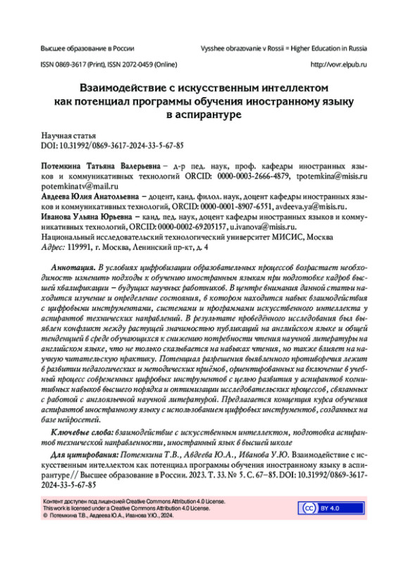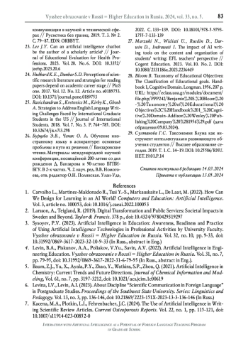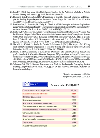 3. Сысоев П.В. Искусственный интеллект в образовании: осведомлённость, готовность и практика применения преподавателями высшей школы технологий искусственного интеллекта в профессиональной деятельности // Высшее образование в России. 2023. Т. 32. № 10. С. 9-33. DOI: 10.31992/0869-3617-2023-32-10-9-33 EDN: TZYTKM