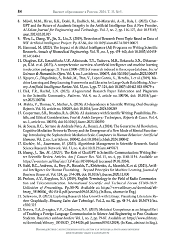 7. Kacena M.A., Plotkin L.I., Fehrenbacher J.C. The use of artificial intelligence in writing scientific review articles // Current Osteoporosis Reports. 2024. Vol. 22. No. 1. P. 115-121. DOI: 10.1007/s11914-023-00852-0 EDN: PDAEEH