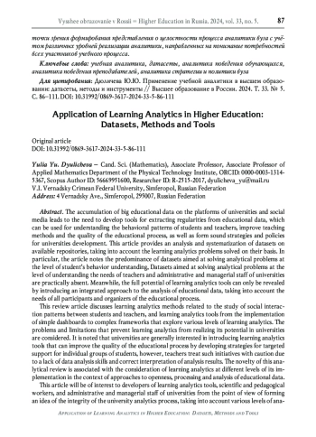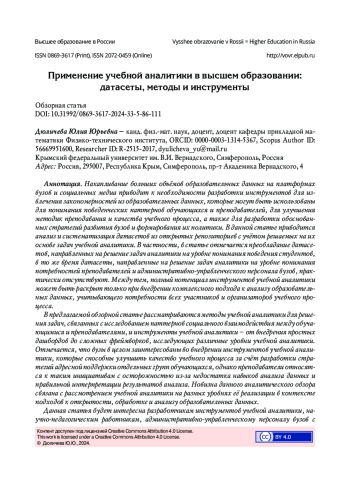 Накапливание больших объёмов образовательных данных на платформах вузов и социальных медиа приводит к необходимости разработки инструментов для извлечения закономерностей из образовательных данных, которые могут быть использованы для понимания поведенческих паттернов обучающихся и преподавателей, для улучшения методик преподавания и качества учебного процесса, а также для разработки обоснованных стратегий развития вузов и формирования их политики. В данной статье приводится анализ и систематизация датасетов из открытых репозиториев с учётом решаемых на их основе задач учебной аналитики. В частности, в статье отмечается преобладание датасетов, направленных на решение задач аналитики на уровне понимания поведения студентов, в то же время датасеты, направленные на решение задач аналитики на уровне понимания потребностей преподавателей и административно-управленческого персонала вузов, практически отсутствуют. Между тем, полный потенциал инструментов учебной аналитики может быть раскрыт только при внедрении комплексного подхода к анализу образовательных данных, учитывающего потребности всех участников и организаторов учебного процесса. В предлагаемой обзорной статье рассматриваются методы учебной аналитики для решения задач, связанных с исследованием паттернов социального взаимодействия между обучающимися и преподавателями, и инструменты учебной аналитики - от внедрения простых дашбордов до сложных фреймворков, исследующих различные уровни учебной аналитики. Отмечается, что вузы в целом заинтересованы во внедрении инструментов учебной аналитики, которые способны улучшить качество учебного процесса за счёт разработки стратегий адресной поддержки отдельных групп обучающихся, однако преподаватели относятся к таким инициативам с осторожностью из-за недостатка навыков анализа данных и правильной интерпретации результатов анализа. Новизна данного аналитического обзора связана с рассмотрением учебной аналитики на разных уровнях её реализации в контексте подходов к открытости, обработке и анализу образовательных данных. Данная статья будет интересна разработчикам инструментов учебной аналитики, научно-педагогическим работникам, административно-управленческому персоналу вузов с точки зрения формирования представления о целостности процесса аналитики вуза с учётом различных уровней реализации аналитики, направленных на понимание потребностей всех участников учебного процесса.