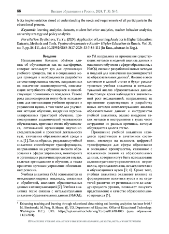 4. Вилкова К.А., Захарова У.С. Учебная аналитика в традиционном образовании: её роль и результаты // Университетское управление: практика и анализ. 2020. Т. 24. № 3. C. 59-76. DOI: 10.15826/umpa.2020.03.026 EDN: LZRMLY