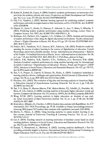 33. Шухман А.Е., Парфенов Д.И., Легашев Л.В., Гришина Л.С. Анализ и прогнозирование успеваемости обучающихся при использовании цифровой образовательной среды // Высшее образование в России. 2021. Т. 30. № 8-9. С. 125-133. DOI: 10.31992/0869-3617-2021-30-8-9-125-133 EDN: QKRTNV