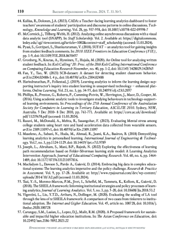 43. Susnjak T., Ramaswami G., Mathrani A. Learning analytics dashboard: a Tool for providing actionable insights to learners // International Journal of Educational Technology in Higher Education. 2022. Vol. 19. No. 12. 23 p. DOI: 10.1186/s41239-021-00313-7 EDN: RDHMGP
