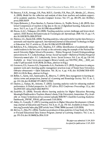 58. Simanca F.A.H., Arteaga I.H., Puin M.E.U., Garrido F.B., Paez J.P., Míndez J.C., Alvarez A. Model for the collection and analysis of data from teachers and students supported by academic analytics // Procedia Computer Science. 2020. Vol. 177. P. 284-291. DOI: 10.1016/j.procs.2020.10.039 EDN: OKUMAG