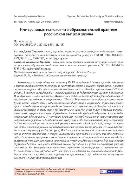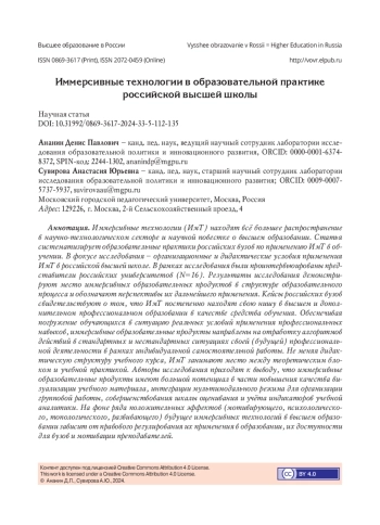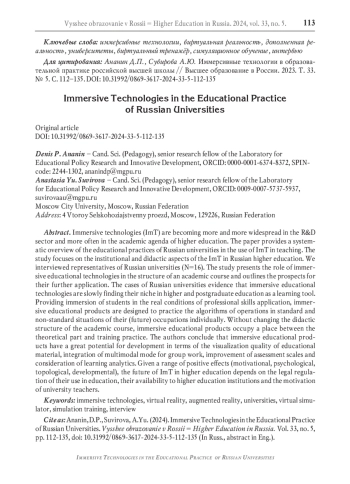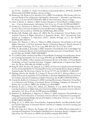 22. Sviridova E., Yastrebova E., Bakirova G., Rebrina F. Immersive Technologies as an Innovative Tool to Increase Academic Success and Motivation in Higher Education // Frontiers in Education. 2023. No. 8. Article no. 1192760. DOI: 10.3389/feduc.2023.1192760 EDN: MLNCJD