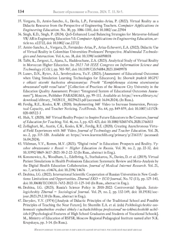 35. Vergara D., Antón-Sancho Á., Dávila L.P., Fernández-Arias P. Virtual Reality as a Didactic Resource from the Perspective of Engineering Teachers // Computer Applications in Engineering Education. 2022. No. 30. P. 1086-1101. DOI: 10.1002/cae.22504 EDN: ZJWMDF