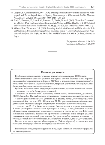 43. Вихман В.В., Ромм М.В. “Цифровые двойники” в образовании: перспективы и реальность // Высшее образование в России. 2021. Т. 30. № 2. С. 22-32. DOI: 10.31992/0869-3617-2021-30-2-22-32 EDN: FODZSG