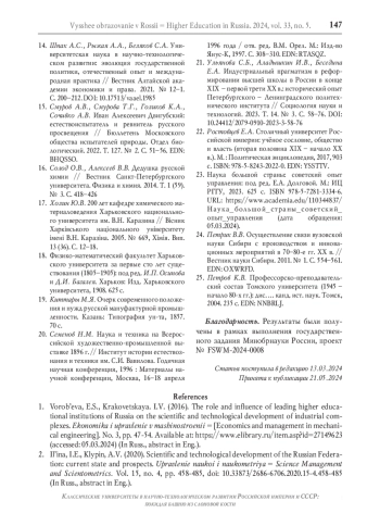 21. Ульянова С.Б., Аладышкин И.В., Беседина Е.А. Индустриальный прагматизм в реформировании высшей школы в России в конце XIX - первой трети ХХ в.: исторический опыт Петербургского - Ленинградского политехнического института // Социология науки и технологий. 2023. Т. 14. № 3. С. 58-76. DOI: 10.24412/2079-0910-2023-3-58-76 EDN: EHOCYG