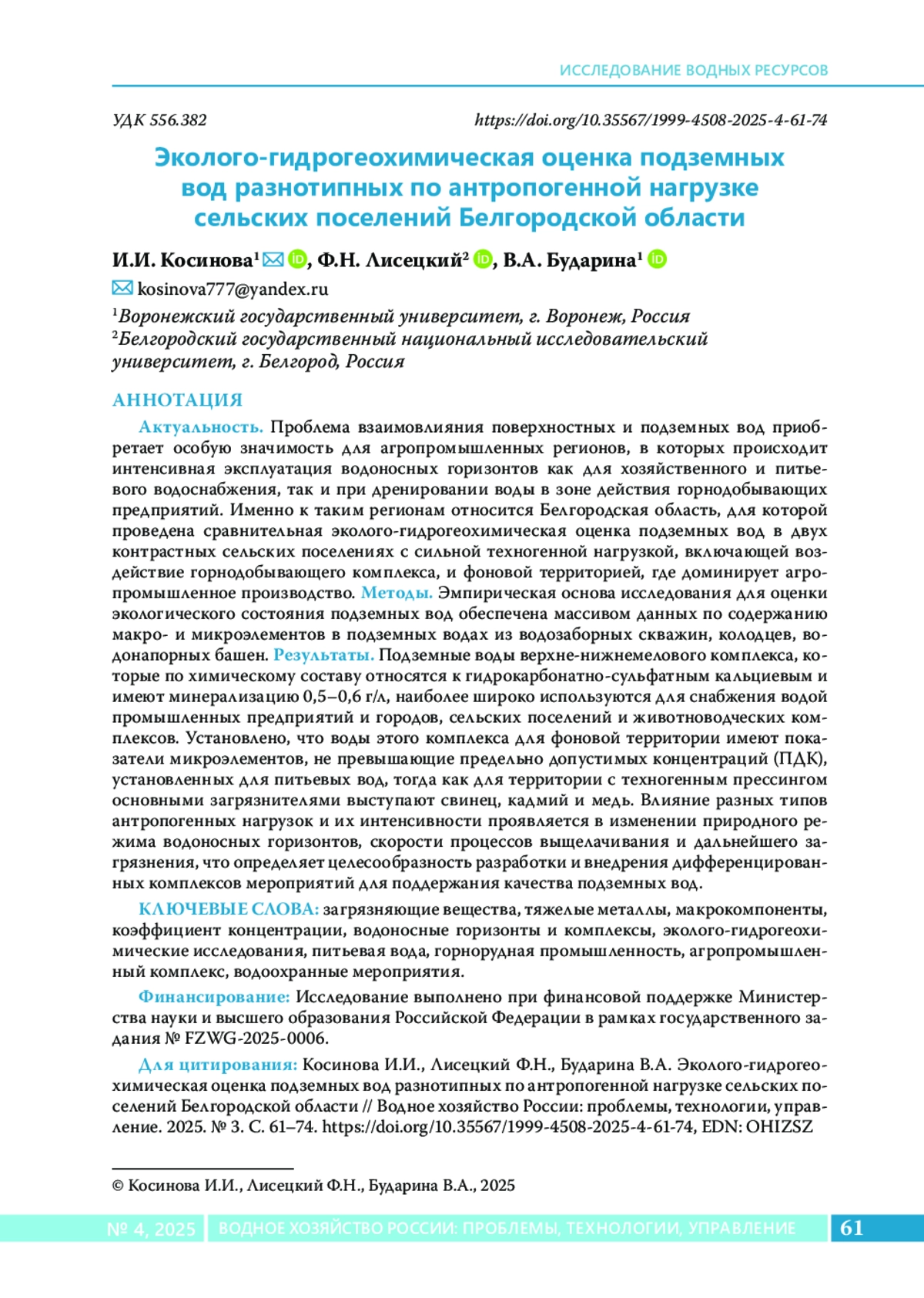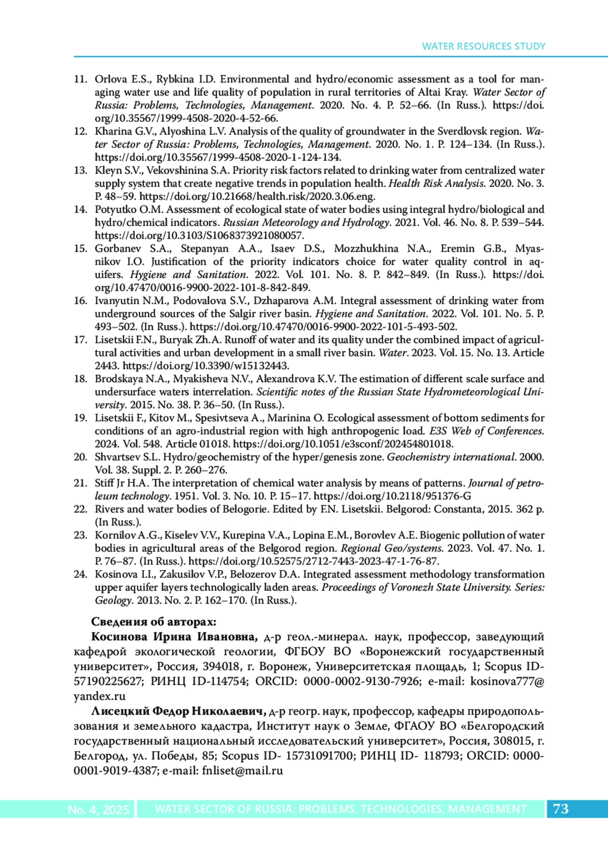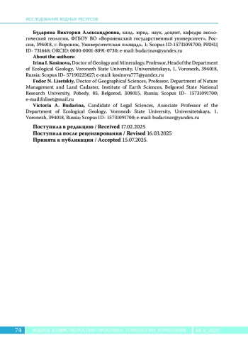 17. Lisetskii F.N., Buryak Z.A.runoff of water and its quality under the combined impact of agricultural activities and urban development in a small river basin // Water. 2023. Vol. 15. No. 13. Article 2443. DOI: 10.3390/w15132443