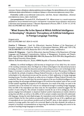 По мере того, как искусственный интеллект (ИИ) становится неотъемлемой частью нашей повседневной жизни, возрастает обеспокоенность педагогического сообщества по поводу правомерности использования данных технологий в учебном процессе. Для того, чтобы адаптировать систему образования и практику работы преподавателей к новым технологическим вызовам, необходим анализ мнения всех заинтересованных сторон. Цель настоящего исследования состоит в выявлении отношения студентов Казанского федерального университета к применению технологий ИИ в учебном процессе и практики их применения в изучении иностранных языков. Для достижения поставленной цели было проведено онлайн-анкетирование студентов Казанского федерального университета (КФУ), в котором были затронуты практические аспекты использования ИИ в языковом образовании, преимущества и недостатки инструментов ИИ с точки зрения студентов, а также мнение студентов относительно перспектив ИИ в образовании. В результате исследования авторы пришли к выводу о том, что на данный момент инструменты ИИ недостаточно распространены в обучении иностранным языкам. Их использует только пятая часть опрошенных, однако комментарии респондентов позволяют предположить, что количество пользователей будет расти. Отношение студентов к использованию ИИ неоднозначное, ответы варьируются от крайне положительных до скептических. Положительные впечатления студентов в основном связаны с возможностью экономии времени и сил при выполнении заданий, а также с изложением сложной информации простым языком. Среди основных недостатков опрошенные отметили ненадёжность данных и ложный контент. Несмотря на то, что студенты в целом положительно относятся к использованию ИИ, значительная часть респондентов не доверяет таким программным продуктам, как ChatGPT, так как, по их мнению, он предоставляет ответы среднего качества, которые необходимо корректировать. На основе полученных данных авторами сформулированы рекомендации для преподавателей по совершенствованию форм преподавания и контроля в процессе обучения иностранному языку в вузе.