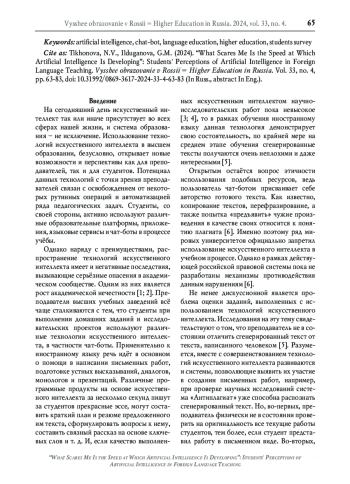 На сегодняшний день искусственный интеллект так или иначе присутствует во всех сферах нашей жизни, и система образования – не исключение. Использование технологий искусственного интеллекта в высшем образовании, безусловно, открывает новые возможности и перспективы как для преподавателей, так и для студентов. Потенциал данных технологий с точки зрения преподавателей связан с освобождением от некоторых рутинных операций и автоматизацией ряда педагогических задач. Студенты, со своей стороны, активно используют различные образовательные платформы, приложения, языковые сервисы и чат-боты в процессе учёбы.