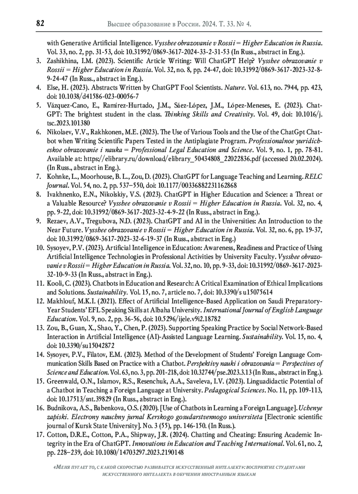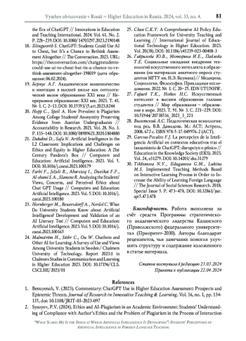 8. Ивахненко Е.Н., Никольский В.С. ChatGPT в высшем образовании и науке: угрозы или ценный ресурс? // Высшее образование в России. 2023. Т. 32. № 4. С. 9-22. DOI: 10.31992/0869-3617-2023-32-4-9-22 EDN: TZHIHU