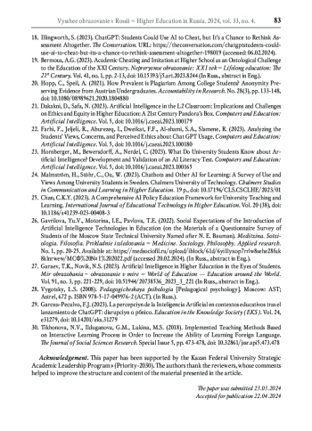 22. Farhi F., Jeljeli R., Aburezeq I., Dweikat F.F., Al-shami S.A., Slamene R. Analyzing the Students’ Views, Concerns, and Perceived Ethics about Chat GPT Usage // Computers and Education: Artificial Intelligence. 2023. Vol. 5. DOI: 10.1016/j.caeai.2023.100180 EDN: TZFCPW