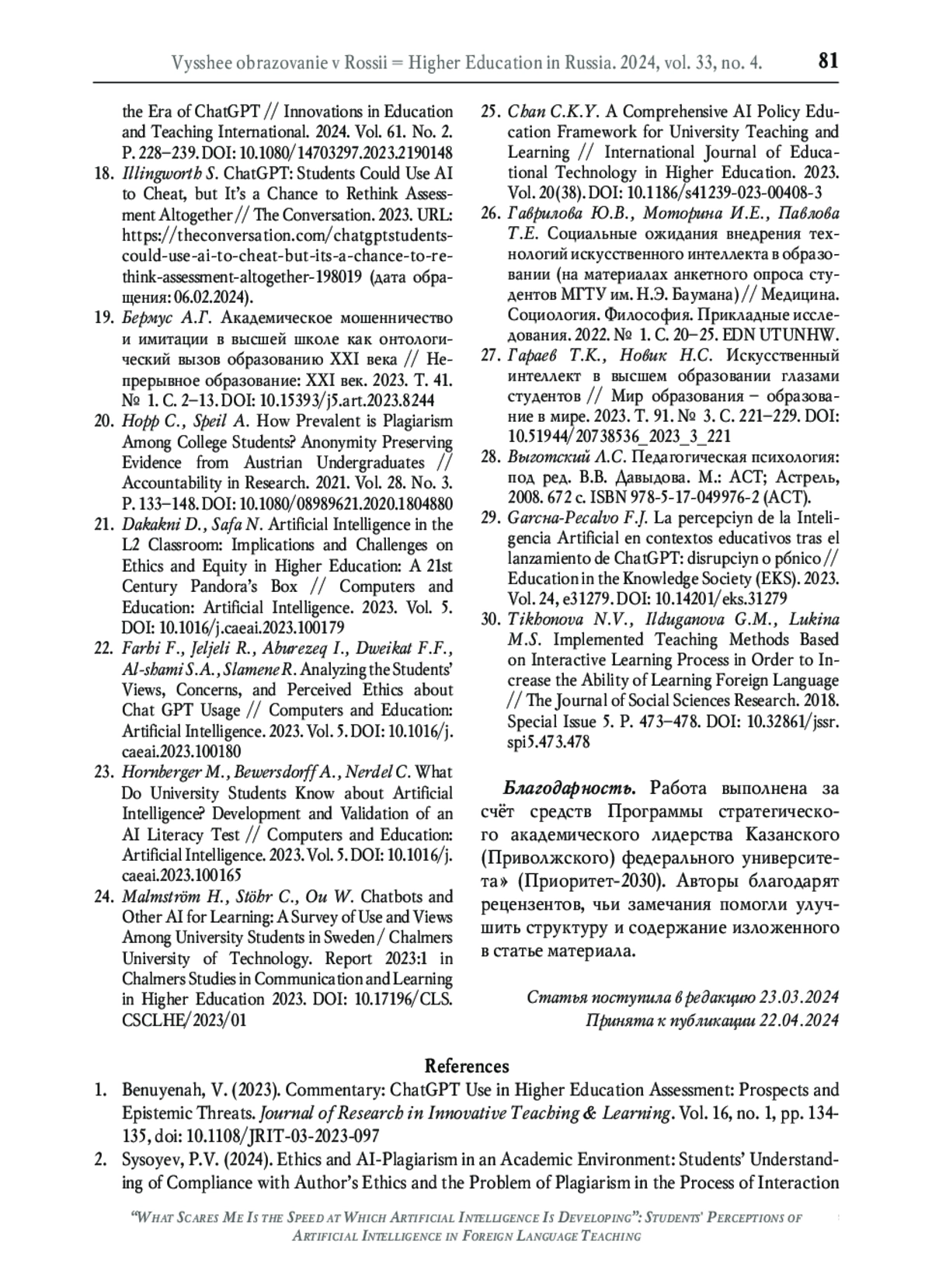 2. Сысоев П.В. Этика и ИИ-плагиат в академической среде: понимание студентами вопросов соблюдения авторской этики и проблемы плагиата в процессе взаимодействия с генеративным искусственным интеллектом // Высшее образование в России. 2024. Т. 33. № 2. С. 31-53. DOI: 10.31992/0869-3617-2024-33-2-31-53 EDN: VTAIUO
