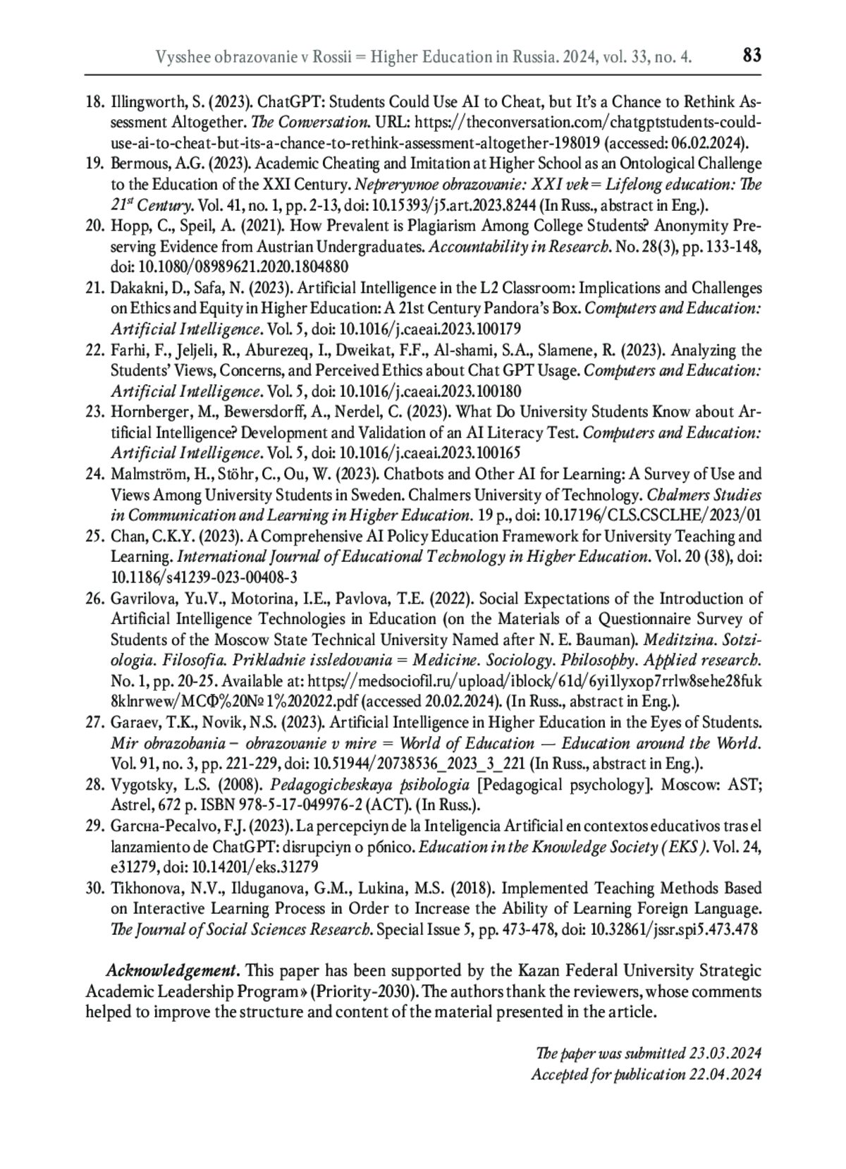 27. Гараев Т.К., Новик Н.С. Искусственный интеллект в высшем образовании глазами студентов // Мир образования - образование в мире. 2023. Т. 91. № 3. С. 221-229. DOI: 10.51944/20738536_2023_3_221 EDN: DRRKXD