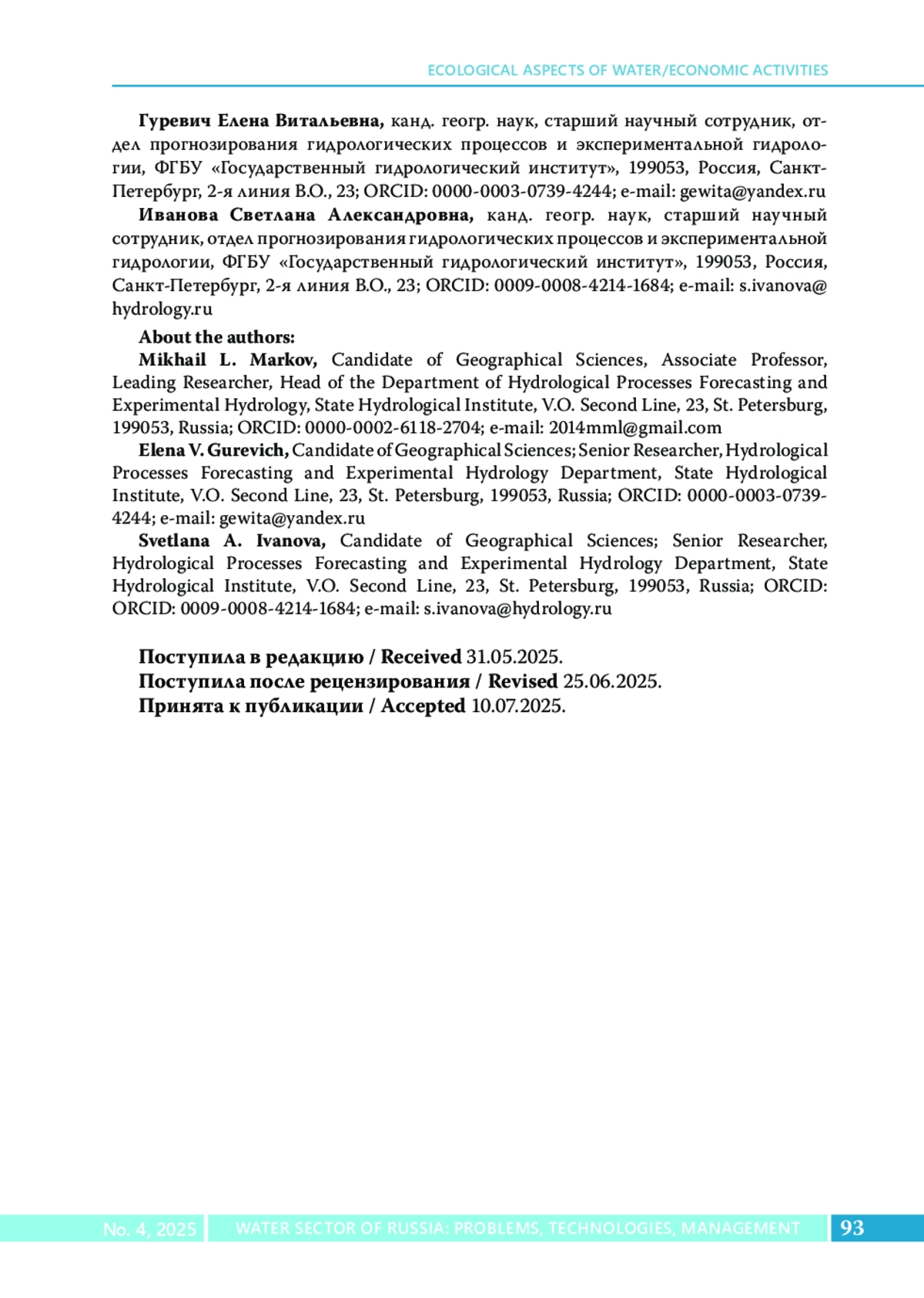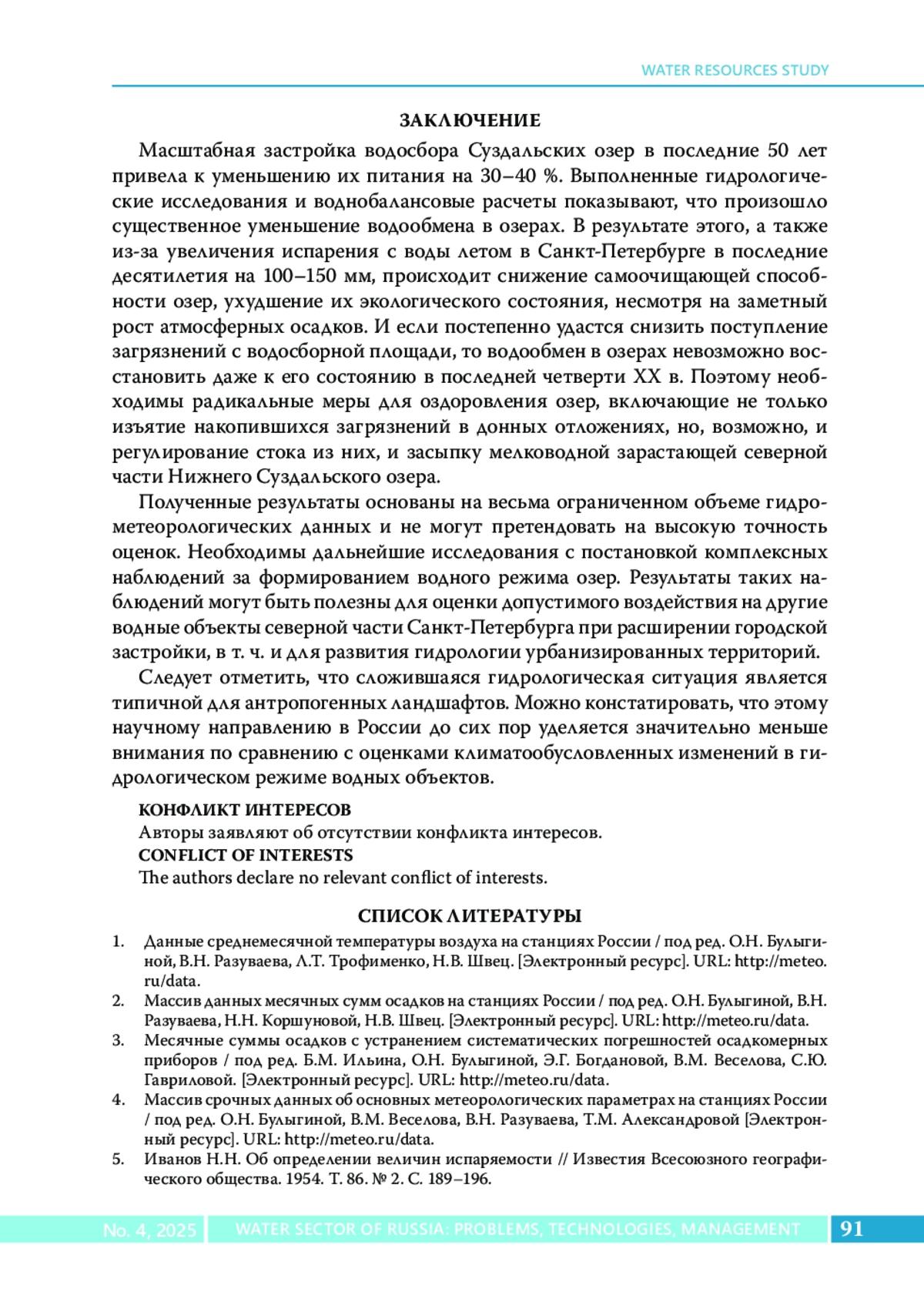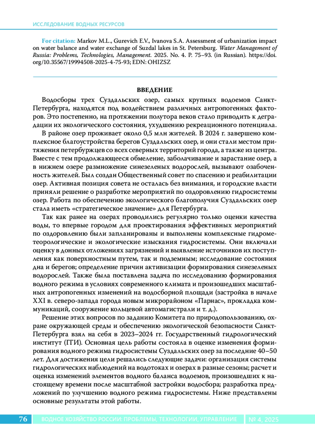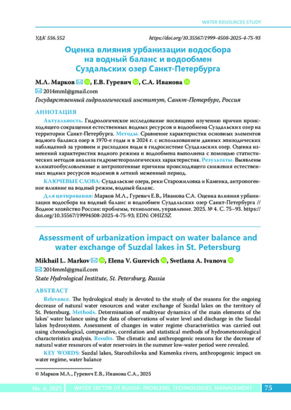 Гидрологическое исследование посвящено изучению причин происходящего сокращения естественных водных ресурсов и водообмена Суздальских озер на территории Санкт-Петербурга. Методы. Сравнение характеристик основных элементов водного баланса озер в 1970-е годы и в 2024 г. с использованием данных эпизодических наблюдений за уровнем и расходами воды в гидросистеме Суздальских озер. Оценка изменений характеристик водного режима и водообмена выполнена с помощью статистических методов анализа гидрометеорологических характеристик. Результаты. Выявлены климатообусловленные и антропогенные причины происходящего снижения естественных водных ресурсов водоемов в летний меженный период.