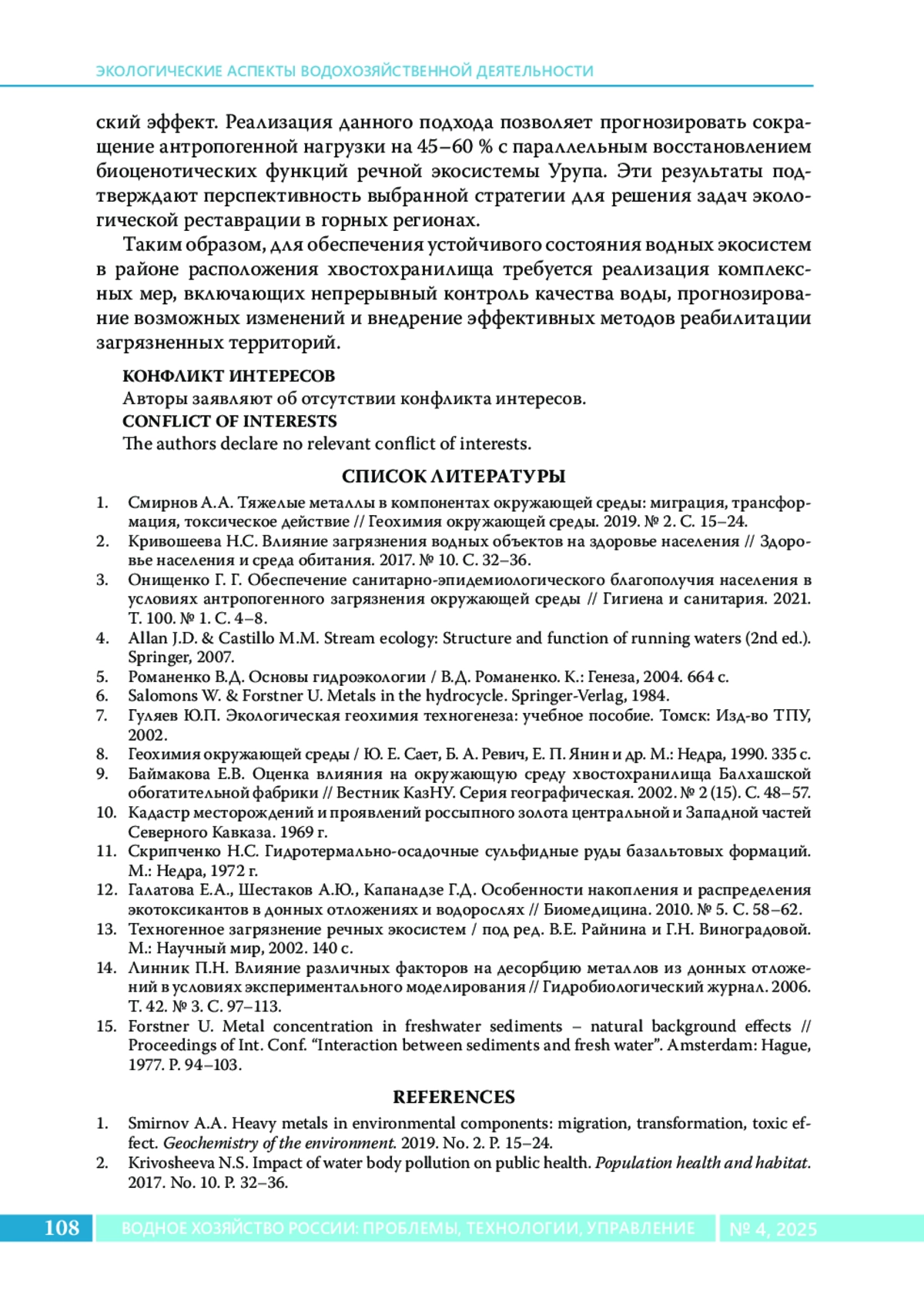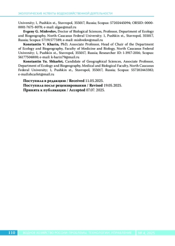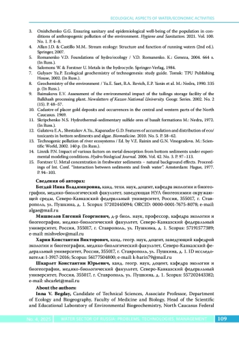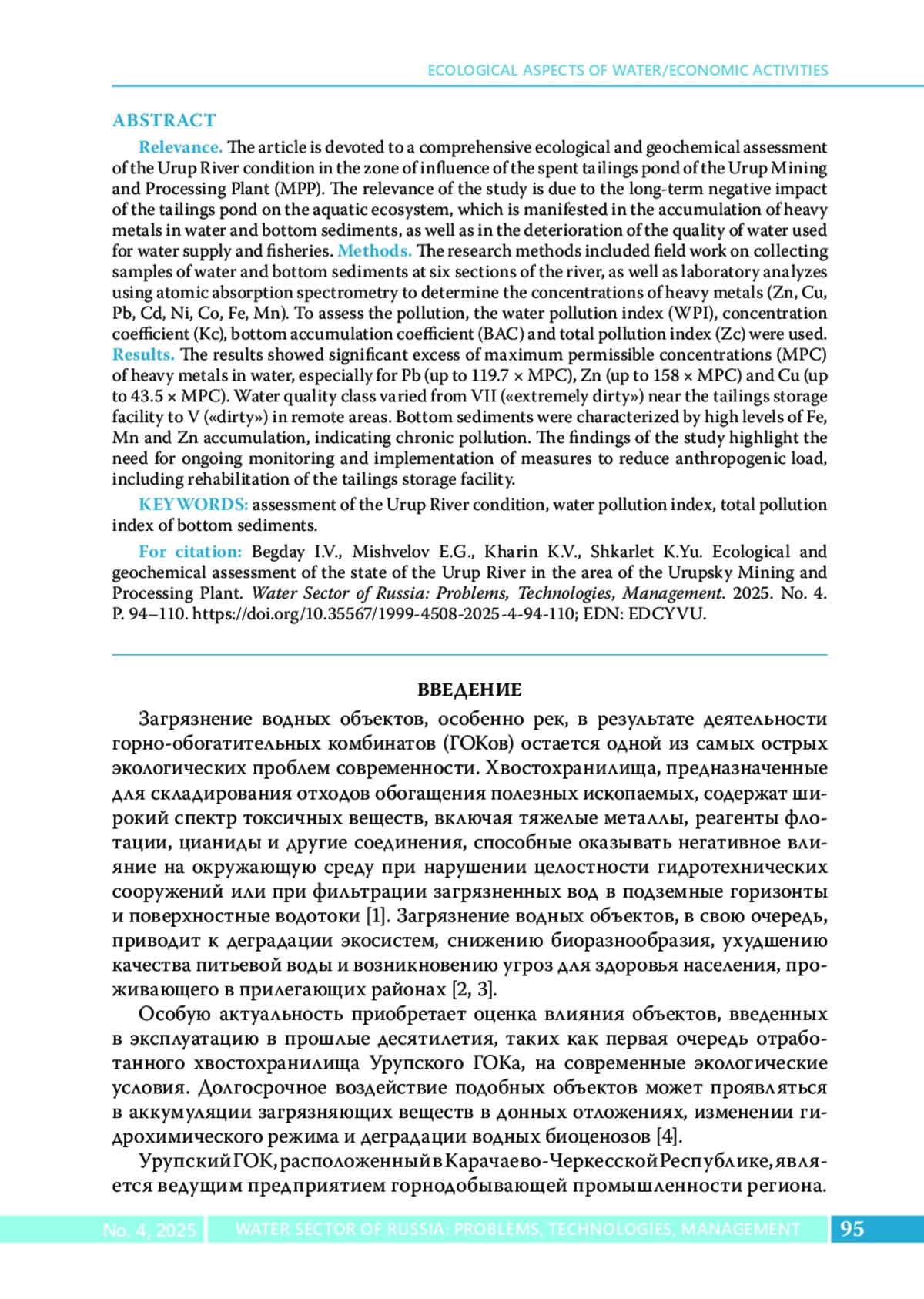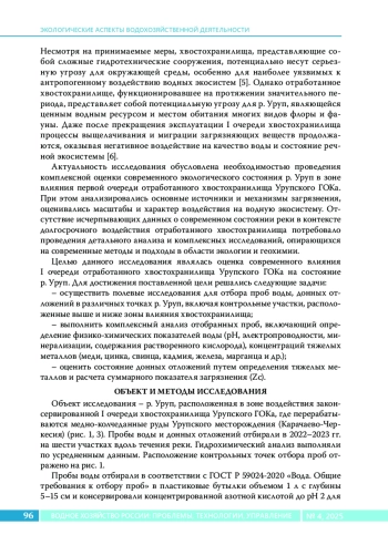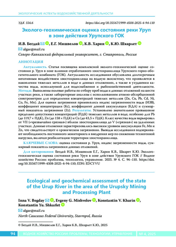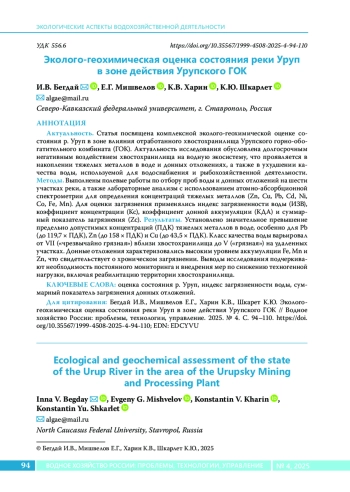 Статья посвящена комплексной эколого-геохимической оценке состояния р. Уруп в зоне влияния отработанного хвостохранилища Урупского горно-обогатительного комбината (ГОК). Актуальность исследования обусловлена долгосрочным негативным воздействием хвостохранилища на водную экосистему, что проявляется в накоплении тяжелых металлов в воде и донных отложениях, а также в ухудшении качества воды, используемой для водоснабжения и рыбохозяйственной деятельности. Методы. Выполнены полевые работы по отбору проб воды и донных отложений на шести участках реки, а также лабораторные анализы с использованием атомно-абсорбционной спектрометрии для определения концентраций тяжелых металлов (Zn, Cu, Pb, Cd, Ni, Co, Fe, Mn). Для оценки загрязнения применялись индекс загрязненности воды (ИЗВ), коэффициент концентрации (Kc), коэффициент донной аккумуляции (КДА) и суммарный показатель загрязнения (Zc). Результаты. Установлено значительное превышение предельно допустимых концентраций (ПДК) тяжелых металлов в воде, особенно для Pb (до 119,7 × ПДК), Zn (до 158 × ПДК) и Cu (до 43,5 × ПДК). Класс качества воды варьировал от VII («чрезвычайно грязная») вблизи хвостохранилища до V («грязная») на удаленных участках. Донные отложения характеризовались высоким уровнем аккумуляции Fe, Mn и Zn, что свидетельствует о хроническом загрязнении. Выводы исследования подчеркивают необходимость постоянного мониторинга и внедрения мер по снижению техногенной нагрузки, включая реабилитацию территории хвостохранилища.