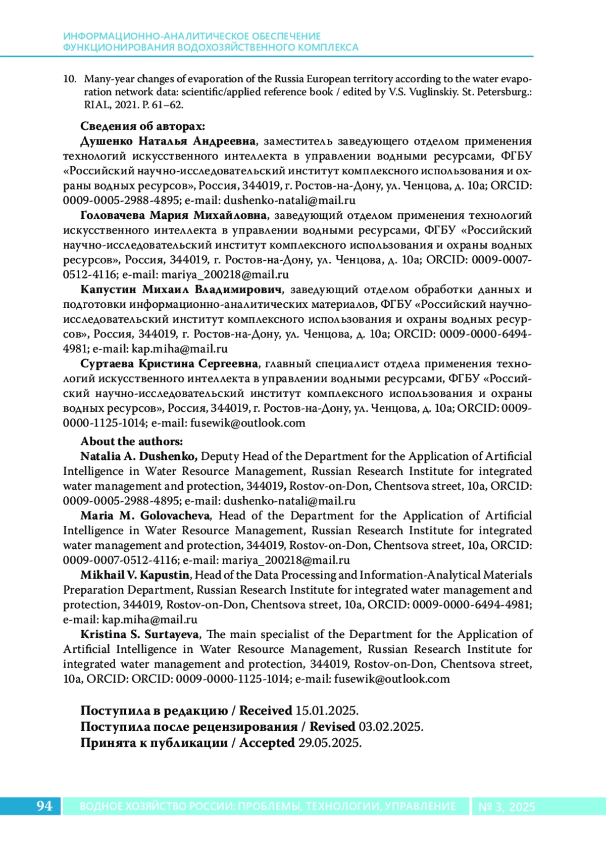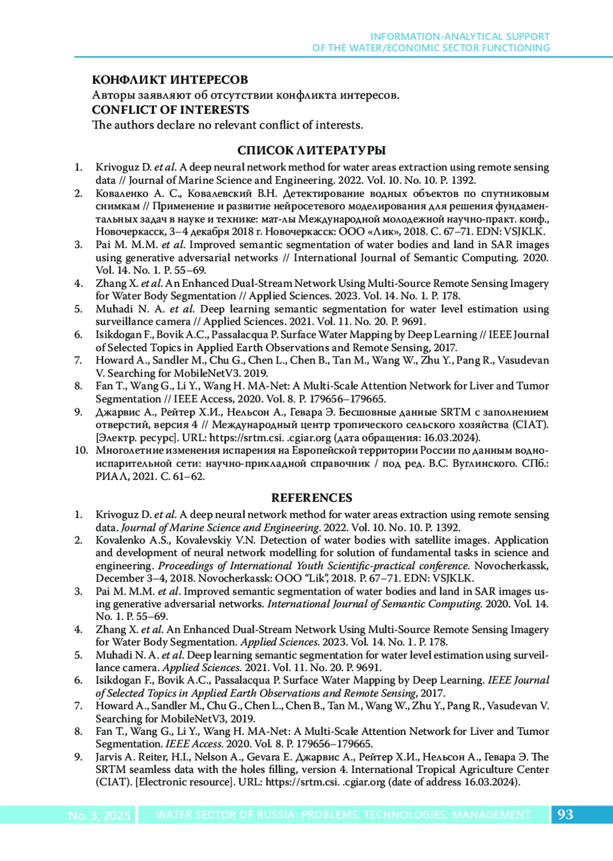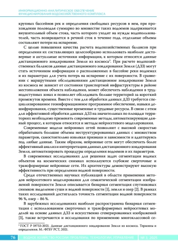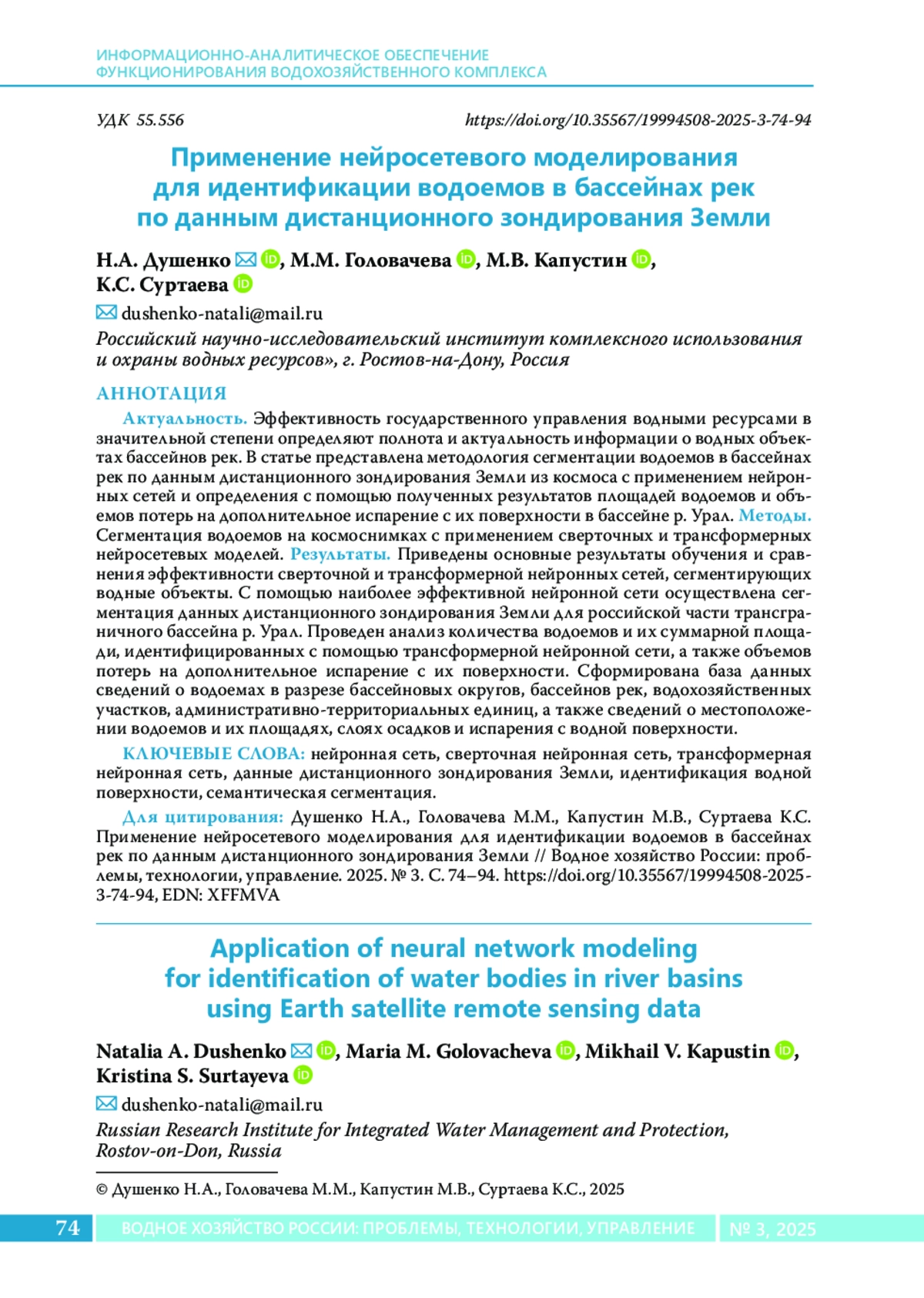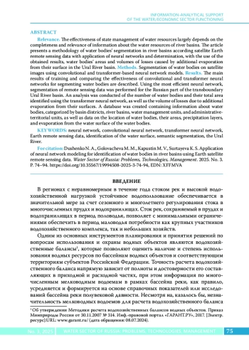 Эффективность государственного управления водными ресурсами в значительной степени определяют полнота и актуальность информации о водных объектах бассейнов рек. В статье представлена методология сегментации водоемов в бассейнах рек по данным дистанционного зондирования Земли из космоса с применением нейронных сетей и определения с помощью полученных результатов площадей водоемов и объемов потерь на дополнительное испарение с их поверхности в бассейне р. Урал. Методы. Сегментация водоемов на космоснимках с применением сверточных и трансформерных нейросетевых моделей. Результаты. Приведены основные результаты обучения и сравнения эффективности сверточной и трансформерной нейронных сетей, сегментирующих водные объекты. С помощью наиболее эффективной нейронной сети осуществлена сегментация данных дистанционного зондирования Земли для российской части трансграничного бассейна р. Урал. Проведен анализ количества водоемов и их суммарной площади, идентифицированных с помощью трансформерной нейронной сети, а также объемов потерь на дополнительное испарение с их поверхности. Сформирована база данных сведений о водоемах в разрезе бассейновых округов, бассейнов рек, водохозяйственных участков, административно-территориальных единиц, а также сведений о местоположении водоемов и их площадях, слоях осадков и испарения с водной поверхности.