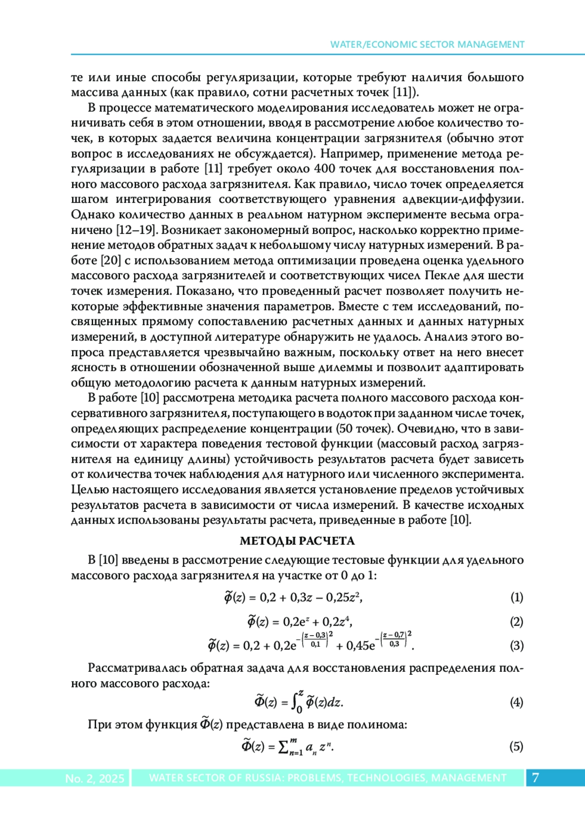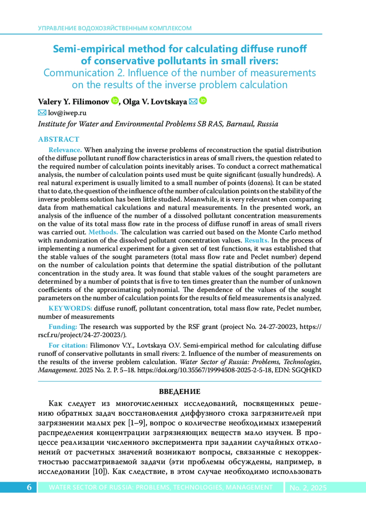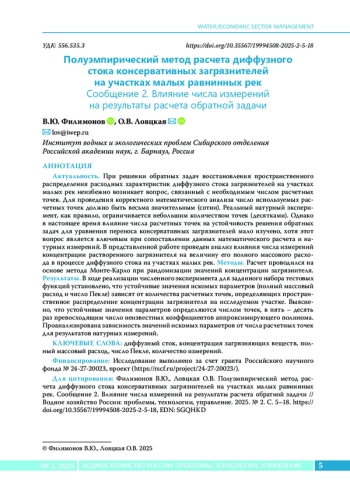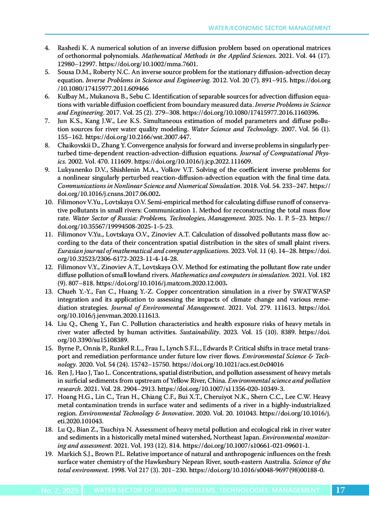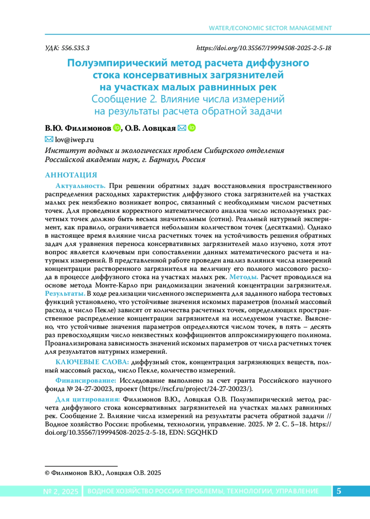 10. Филимонов В.Ю., Ловцкая О.В. Полуэмпирический метод расчета диффузного стока консервативных загрязнителей на участках малых равнинных рек: 1. Восстановление полного массового расхода загрязнителей // Водное хозяйство России: проблемы, технологии, управление. 2025. № 1. С. 5-23. ,. DOI: 10.35567/19994508-2025-1-5-23