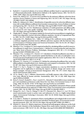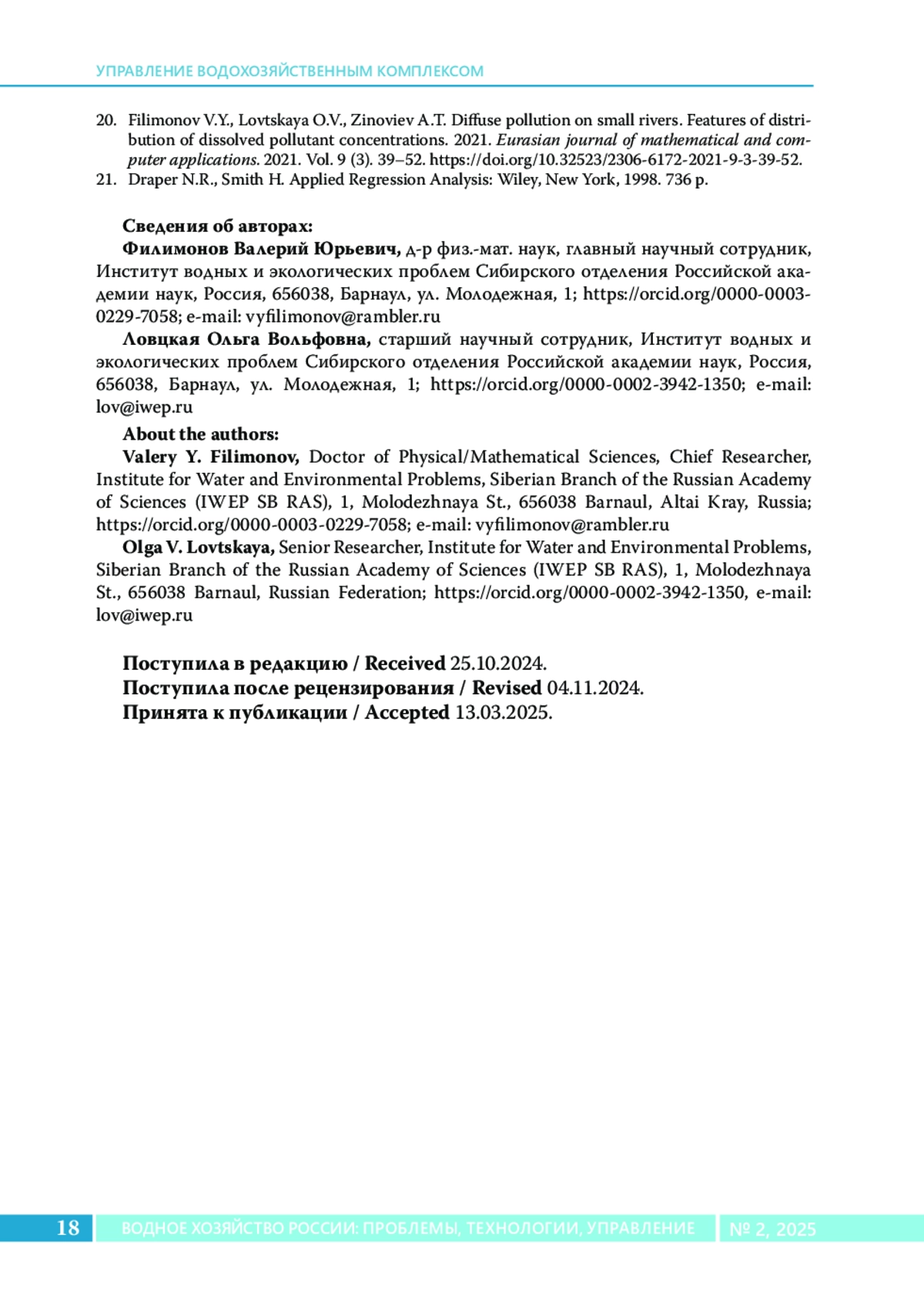 20. Filimonov V.Y., Lovtskaya O.V., Zinoviev A.T. Diffuse pollution on small rivers. Features of distribution of dissolved pollutant concentrations. 2021. // Eurasian journal of mathematical and computer applications. 2021. Vol. 9 (3). P. 39-52. DOI: 10.32523/2306-6172-2021-9-3-39-52