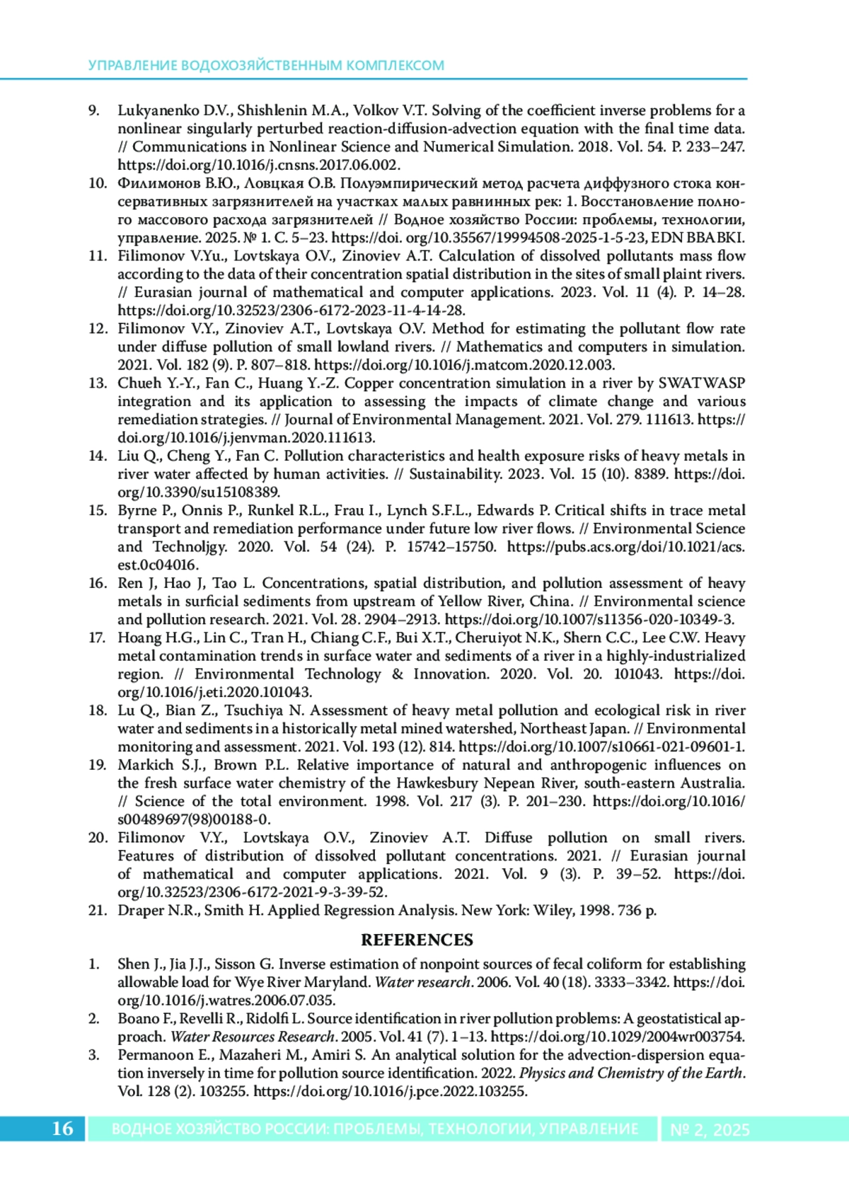 12. Filimonov V.Y., Zinoviev A.T., Lovtskaya O.V. Method for estimating the pollutant flow rate under diffuse pollution of small lowland rivers. // Mathematics and computers in simulation. 2021. Vol. 182 (9). P. 807-818. DOI: 10.1016/j.matcom.2020.12.003