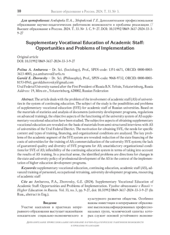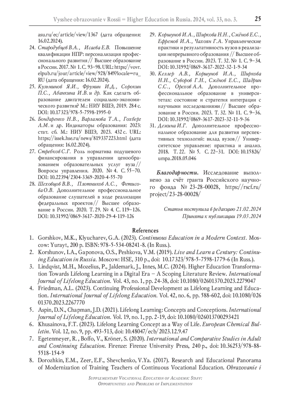 30. Келлер А.В., Коршунов И.А., Ширкова Н.Н., Суворов Г.Н., Сжёнов Е.С., Шадрин С.С., Орехов А.А. Дополнительное профессиональное образование в университетах: состояние и стратегия интеграции с научными исследованиями // Высшее образование в России. 2023. Т. 32. № 11. С. 9-36. DOI: 10.31992/0869-3617-2023-32-11-9-36 EDN: YTDBAN
