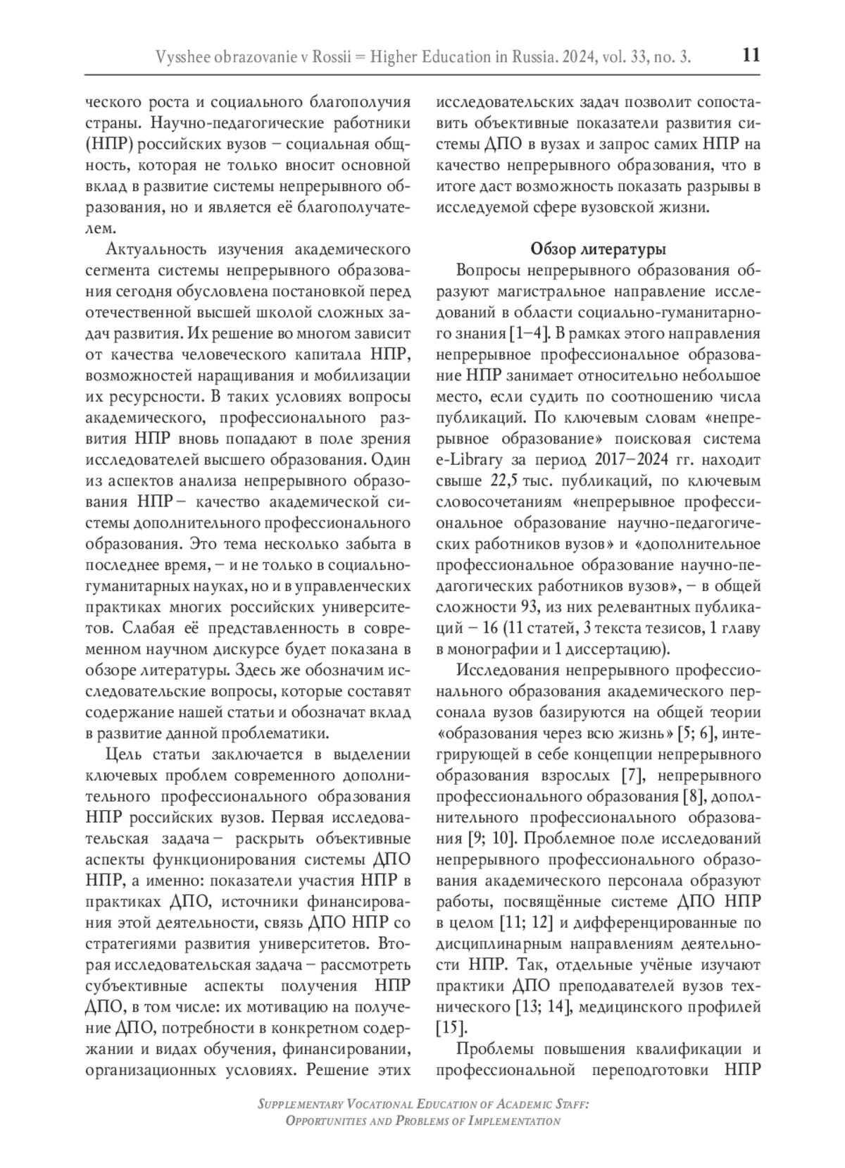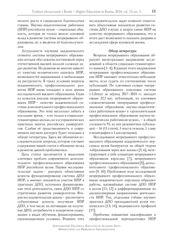 Актуальность изучения академического сегмента системы непрерывного образования сегодня обусловлена постановкой перед отечественной высшей школой сложных задач развития. Их решение во многом зависит от качества человеческого капитала НПР, возможностей наращивания и мобилизации их ресурсности. В таких условиях вопросы академического, профессионального развития НПР вновь попадают в поле зрения исследователей высшего образования. Один из аспектов анализа непрерывного образования НПР – качество академической системы дополнительного профессионального образования. Это тема несколько забыта в последнее время, – и не только в социально-гуманитарных науках, но и в управленческих практиках многих российских университетов. Слабая её представленность в современном научном дискурсе будет показана в обзоре литературы. Здесь же обозначим исследовательские вопросы, которые составят содержание нашей статьи и обозначат вклад в развитие данной проблематики.