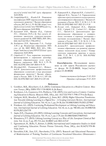 2. Коршунов И.А., Гапонова О.С., Пешкова В.М. Век живи - век учись: непрерывное образование в России. М.: НИУ ВШЭ, 2019. 310 с. DOI: 10.17323/978-5-7598-1779-6 EDN: TQWUIV