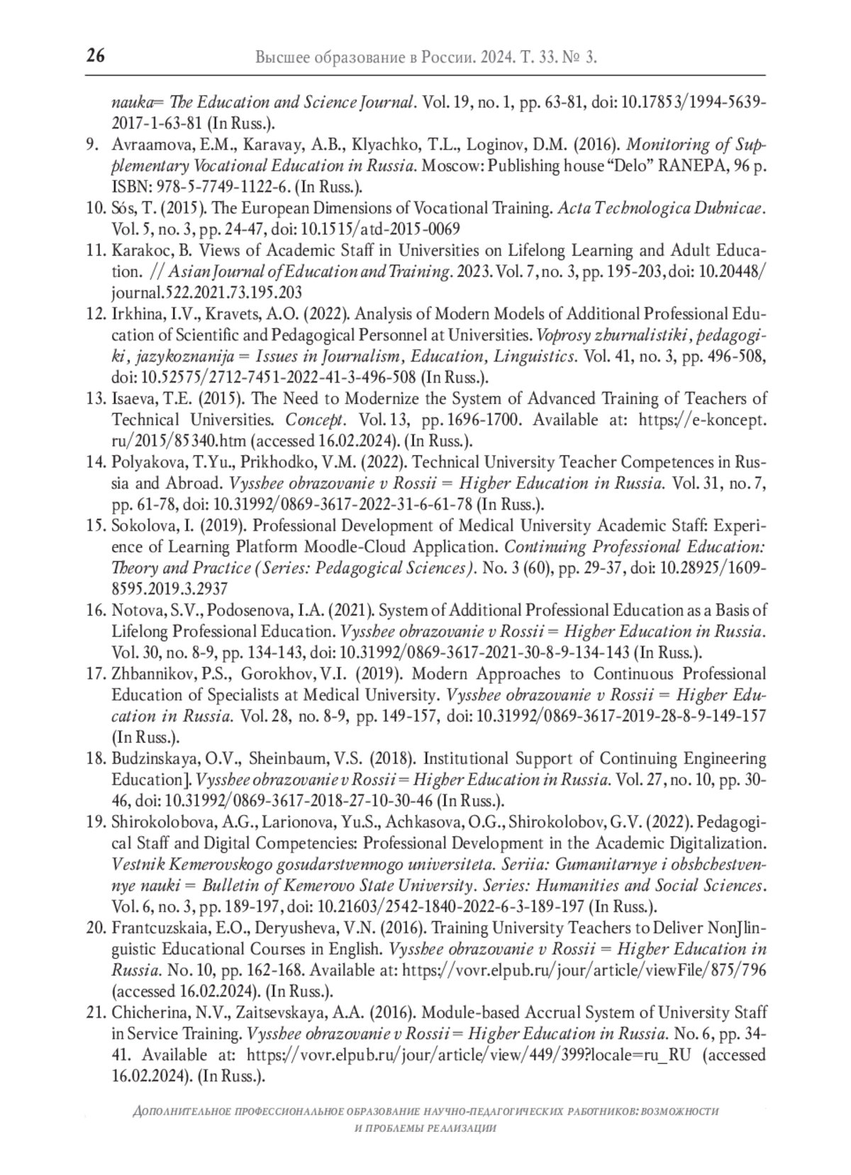 9. Авраамова Е.М., Каравай А.В., Клячко Т.Л., Логинов Д.М. Мониторинг дополнительного профессионального образования в России. М.: Издательский дом “Дело” РАНХиГС, 2016. 96 с. ISBN: 978-5-7749-1122-6 EDN: WNFHJX