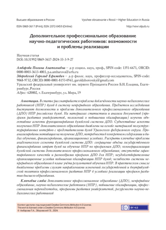В статье рассматривается проблема вовлечённости научно-педагогических работников (НПР) вузов в систему непрерывного образования. Предметом исследования выступают возможности и проблемы дополнительного профессионального образования (ДПО) НПР российских вузов. На материалах статистики и анализа документов (программ развития университетов, положений о повышении квалификации) изучены объективные аспекты функционирования вузовской системы ДПО. Субъективные аспекты получения НПР дополнительного образования выявлены на основе материалов полуструктурированных интервью с представителями вузов Уральского федерального округа. Проанализированы мотивация на получение ДПО, потребности в конкретном содержании и видах обучения, финансировании, организационных условиях. Раскрыты ключевые проблемы академического сегмента вузовской системы ДПО: сокращение объёма государственного финансирования затрат вузов на обучение НПР по программам ДПО; коммерциализация вузовской системы дополнительного профессионального образования; отсутствие гарантированного качества и разнообразия программ ДПО для НПР; неудовлетворительные организационные условия повышения квалификации НПР вузов; негибкость системы непрерывного образования в плане учёта результатов обучения НПР. В практическом смысле выявленные проблемы служат направлениями изменений государственной и внутривузовской политики профессионального развития НПР в условиях реализации программ развития высшего образования.