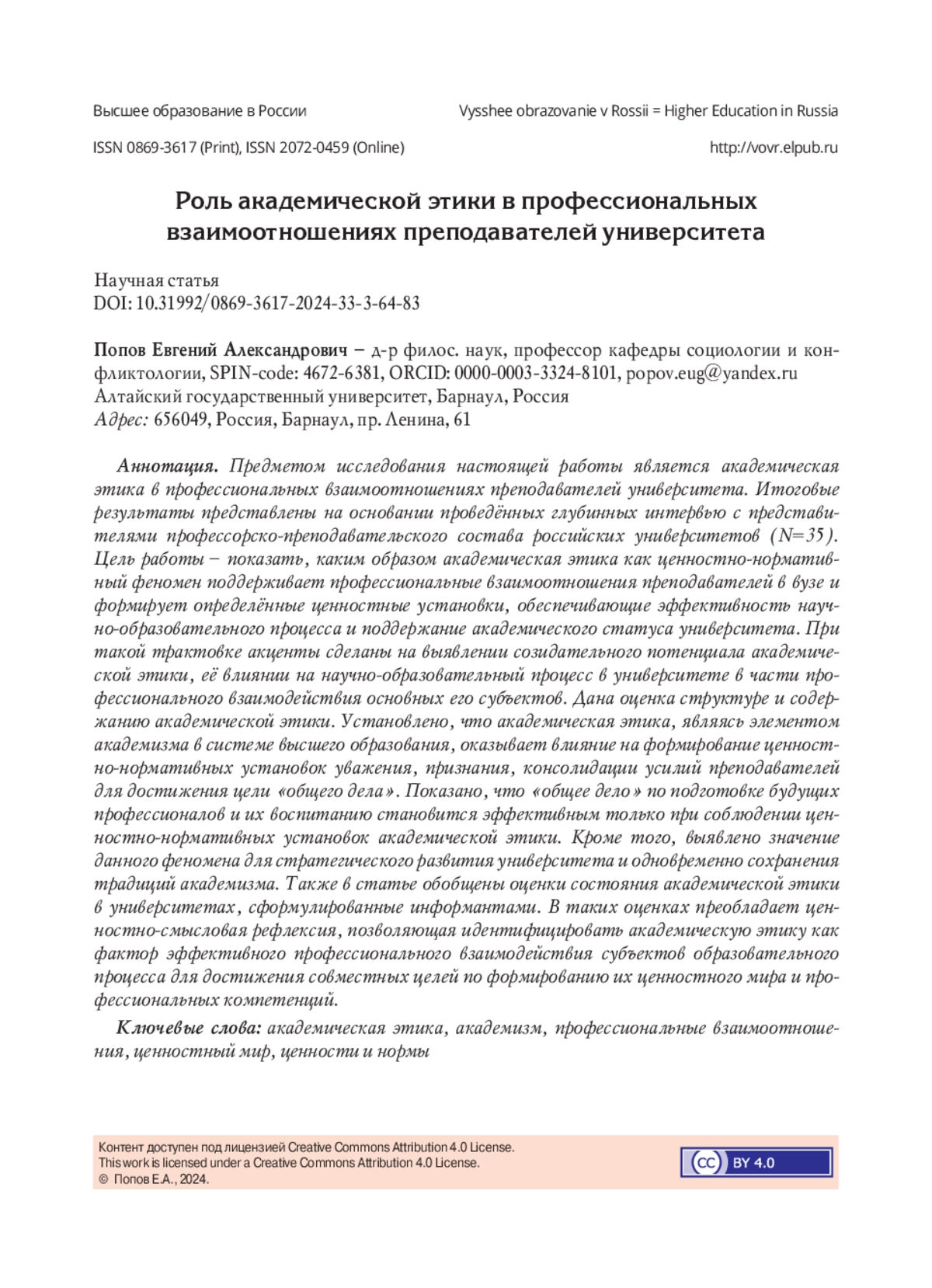 25. Прокофьев А.В. Академическая этика как этика “высокой” профессии: уточнённая локализация проблем // Ведомости прикладной этики. 2012. № 40. С. 126-140. EDN: RNKJMX
