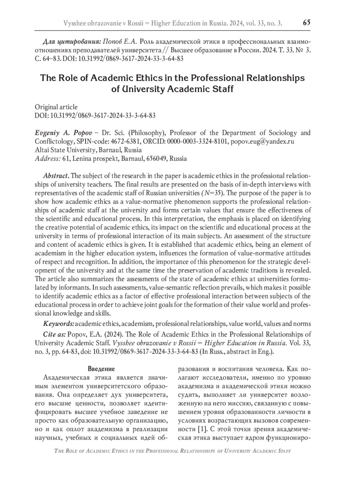 38. Скворцов А. Академическая этика в пограничной ситуации: есть ли надежда на спасение? // Ведомости прикладной этики. 2020. Вып. 55. С. 42-52. EDN: RJJQTL