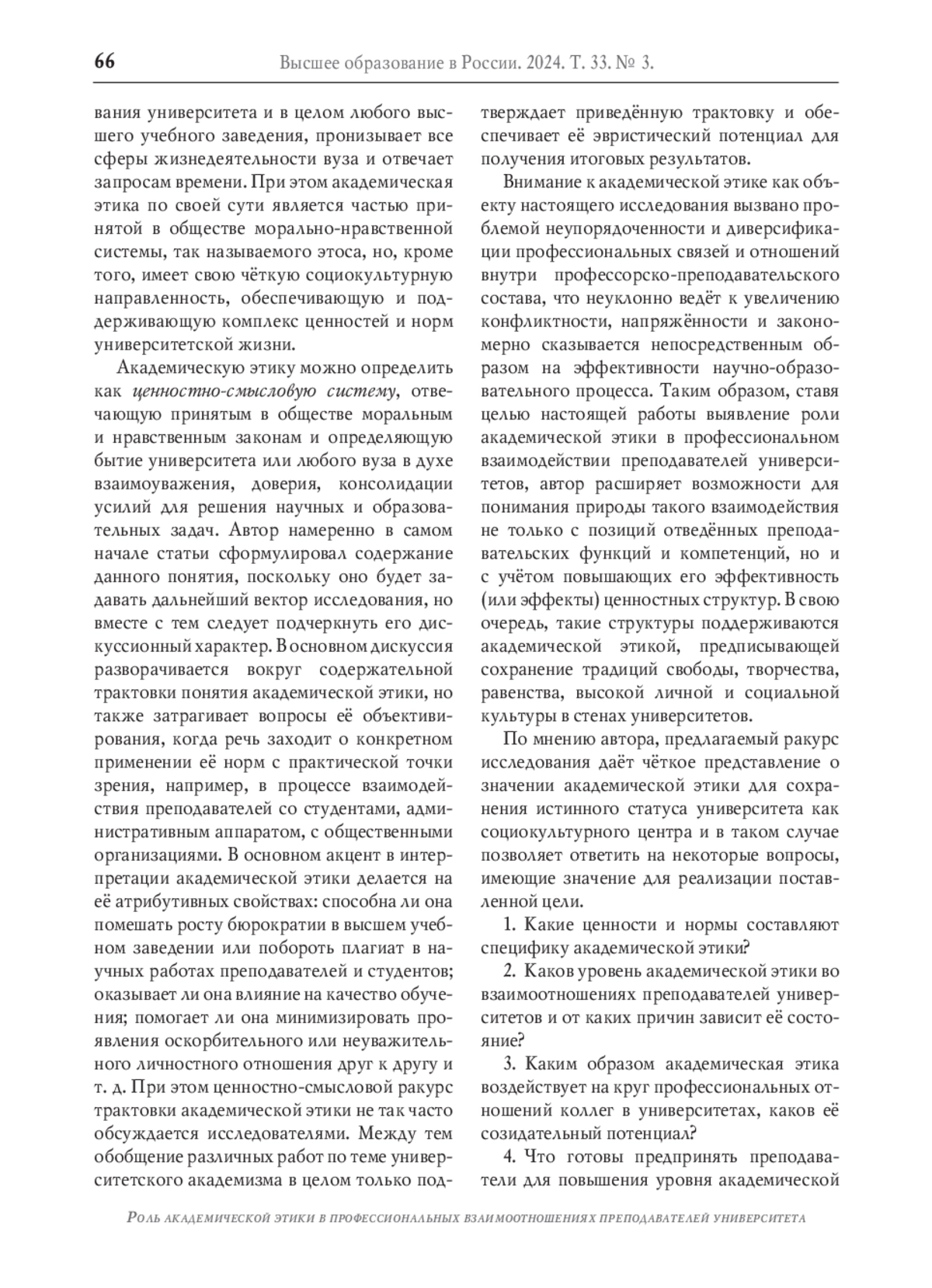 Внимание к академической этике как объекту настоящего исследования вызвано проблемой неупорядоченности и диверсификации профессиональных связей и отношений внутри профессорско-преподавательского состава, что неуклонно ведёт к увеличению конфликтности, напряжённости и закономерно сказывается непосредственным образом на эффективности научно-образовательного процесса. Таким образом, ставя целью настоящей работы выявление роли академической этики в профессиональном взаимодействии преподавателей университетов, автор расширяет возможности для понимания природы такого взаимодействия не только с позиций отведённых преподавательских функций и компетенций, но и с учётом повышающих его эффективность (или эффекты) ценностных структур. В свою очередь, такие структуры поддерживаются академической этикой, предписывающей сохранение традиций свободы, творчества, равенства, высокой личной и социальной культуры в стенах университетов.