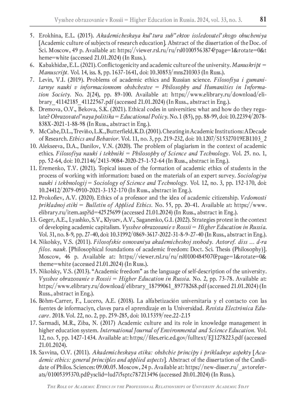 26. Макарова М.Н. Академическая этика за рубежом и в России: как предотвратить студенческие нарушения в вузах? Ижевск: Издательский центр “Удмуртский университет”, 2021. 256 с. EDN: TWOCCY