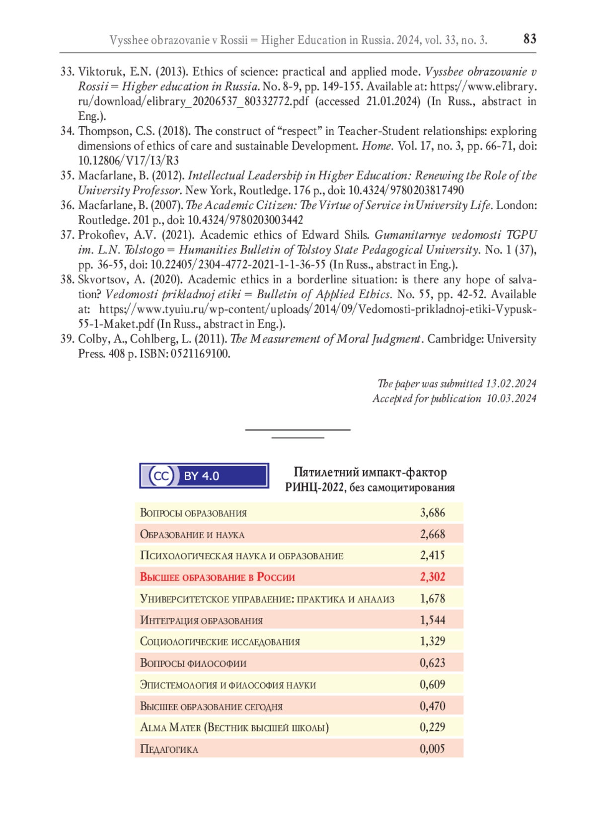33. Викторук Е.Н. Этика науки: практико-прикладной модус // Высшее образование в России. 2013. № 8-9. С. 149-155. EDN: RAERGZ