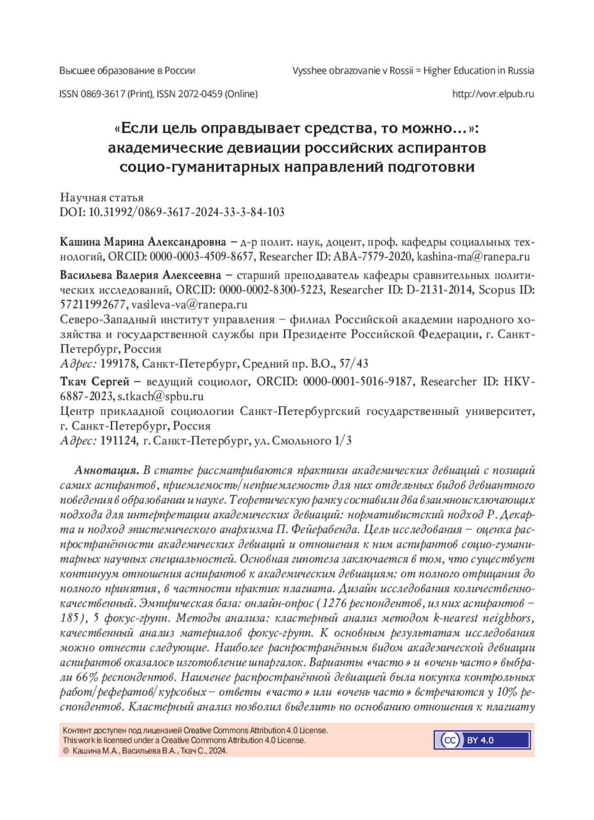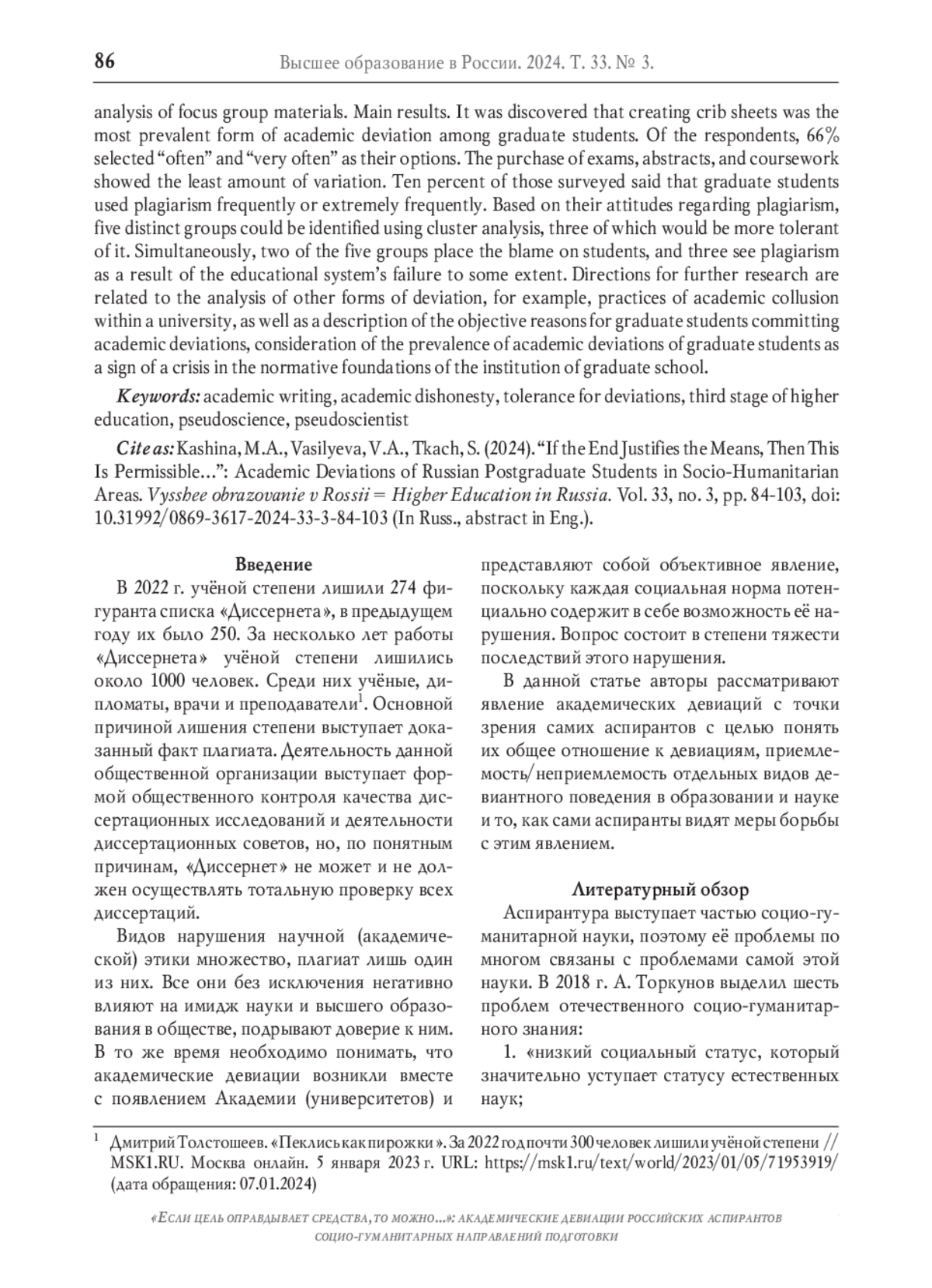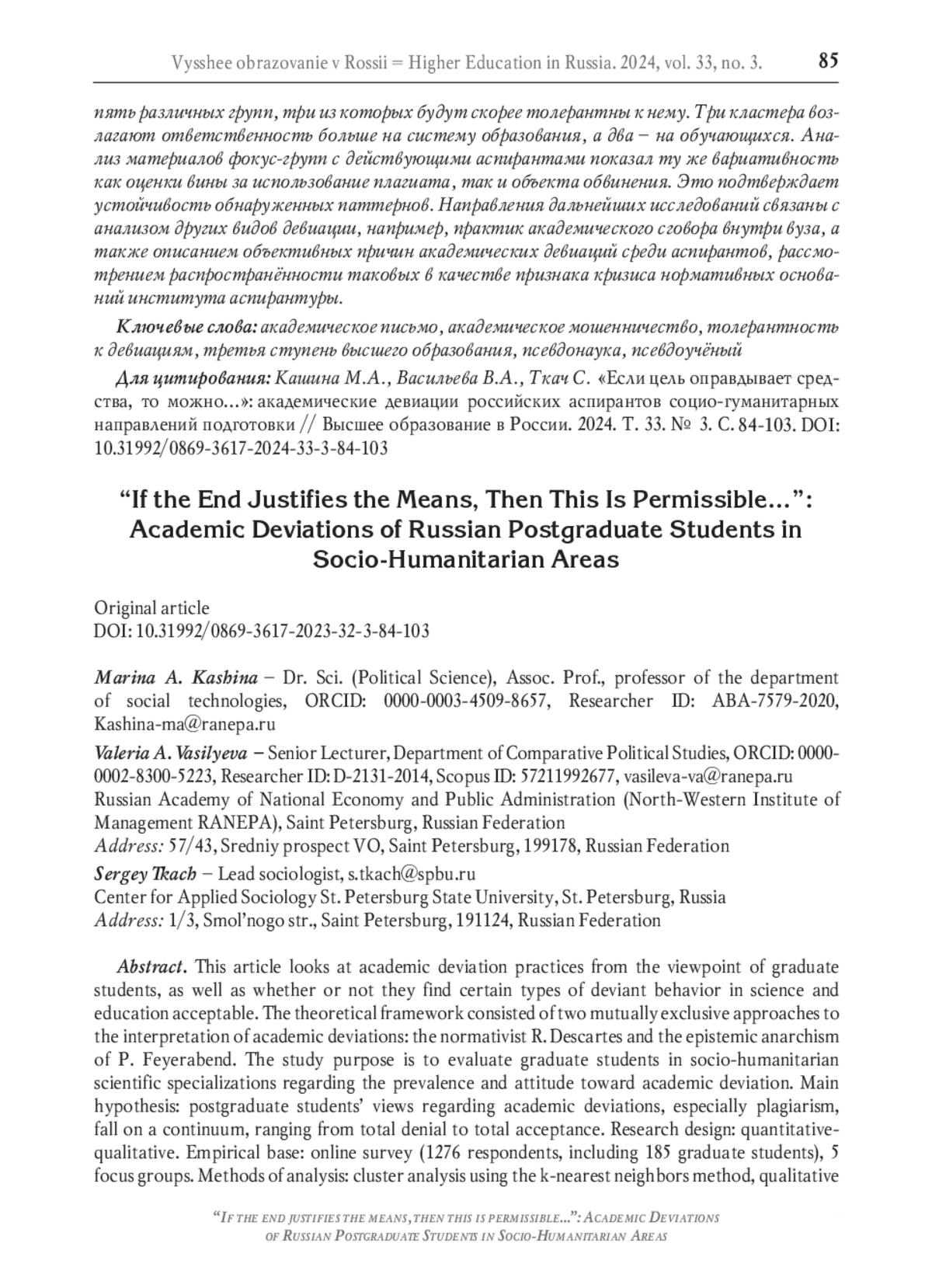 В статье рассматриваются практики академических девиаций с позиций самих аспирантов, приемлемость/неприемлемость для них отдельных видов девиантного поведения в образовании и науке. Теоретическую рамку составили два взаимноисключающих подхода для интерпретации академических девиаций: нормативистский подход Р. Декарта и подход эпистемического анархизма П. Фейерабенда. Цель исследования - оценка распространённости академических девиаций и отношения к ним аспирантов социо-гуманитарных научных специальностей. Основная гипотеза заключается в том, что существует континуум отношения аспирантов к академическим девиациям: от полного отрицания до полного принятия, в частности практик плагиата. Дизайн исследования количественно-качественный. Эмпирическая база: онлайн-опрос (1276 респондентов, из них аспирантов - 185), 5 фокус-групп. Методы анализа: кластерный анализ методом k-nearest neighbors, качественный анализ материалов фокус-групп. К основным результатам исследования можно отнести следующие. Наиболее распространённым видом академической девиации аспирантов оказалось изготовление шпаргалок. Варианты «часто» и «очень часто» выбрали 66% респондентов. Наименее распространённой девиацией была покупка контрольных работ/рефератов/курсовых - ответы «часто» или «очень часто» встречаются у 10% респондентов. Кластерный анализ позволил выделить по основанию отношения к плагиату пять различных групп, три из которых будут скорее толерантны к нему. Три кластера возлагают ответственность больше на систему образования, а два - на обучающихся. Анализ материалов фокус-групп с действующими аспирантами показал ту же вариативность как оценки вины за использование плагиата, так и объекта обвинения. Это подтверждает устойчивость обнаруженных паттернов. Направления дальнейших исследований связаны с анализом других видов девиации, например, практик академического сговора внутри вуза, а также описанием объективных причин академических девиаций среди аспирантов, рассмотрением распространённости таковых в качестве признака кризиса нормативных оснований института аспирантуры.