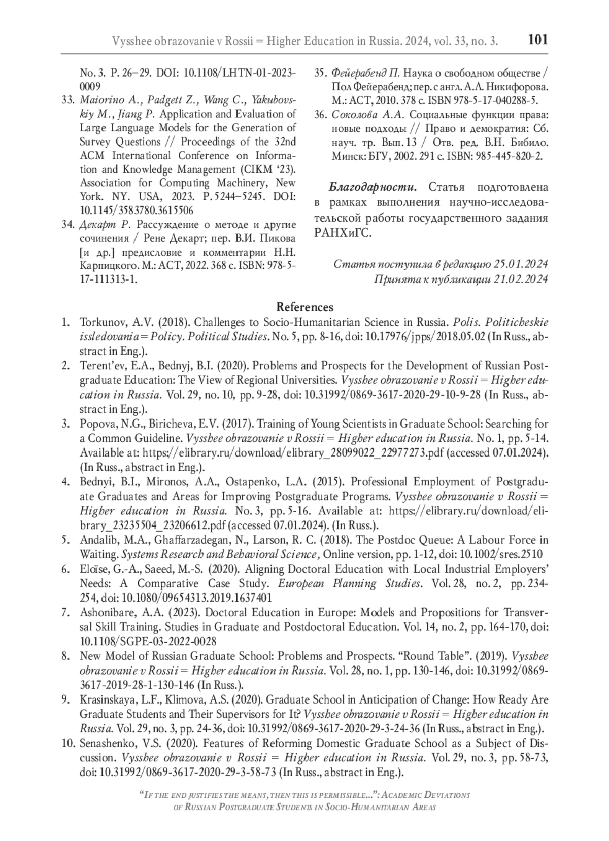 10. Сенашенко В.С. Особенности реформирования отечественной аспирантуры как предмет дискуссии // Высшее образование в России. 2020. Т. 29. № 3. С. 58-73. DOI: 10.31992/0869-3617-2020-29-3-58-73 EDN: PFZFZG
