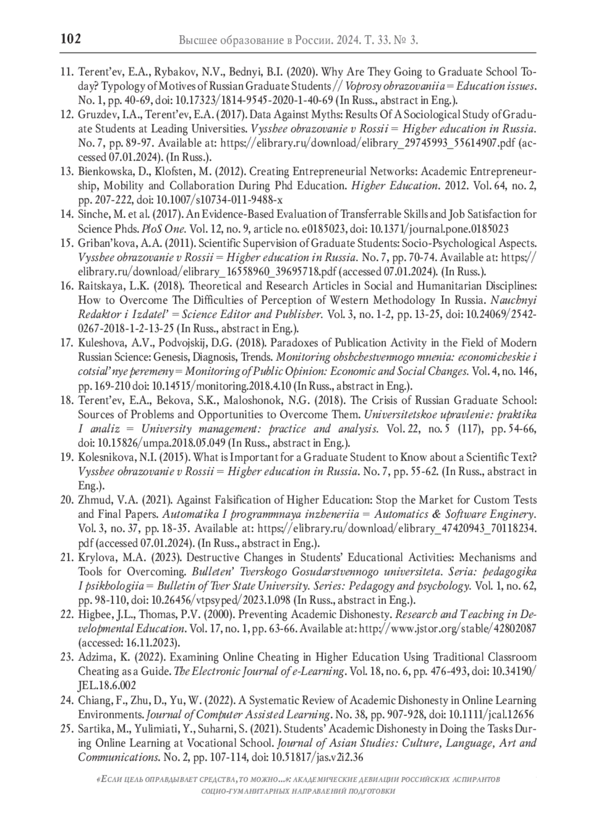 18. Терентьев Е.А. Кризис российской аспирантуры: источники проблем и возможности их преодоления / Е.А. Терентьев, С.К. Бекова, Н.Г. Малошонок // Университетское управление: практика и анализ. 2018. Т. 22. № 5 (117). С. 54-66. DOI: 10.15826/umpa.2018.05.049 EDN: YVZMBF