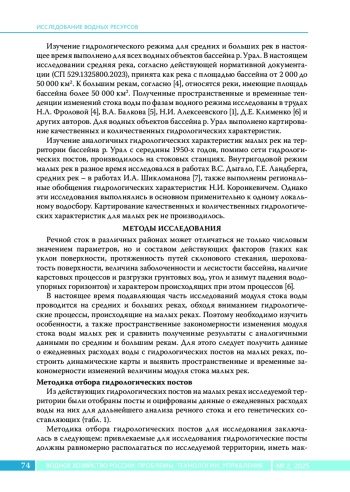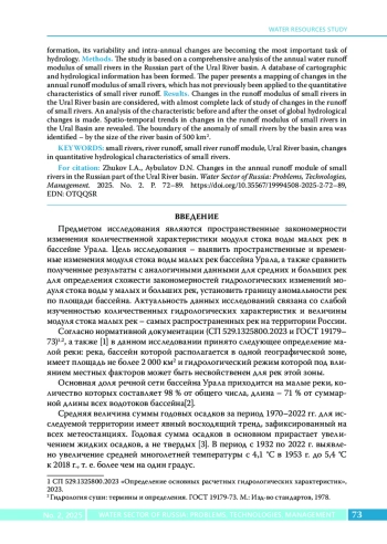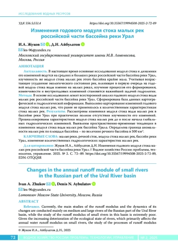 В настоящее время основные исследования модуля стока и динамики его изменений ведутся на средних и больших реках российской части бассейна реки Урал, изученность же модуля стока малых рек этого бассейна крайне мала. Учитывая возрастающее ухудшение экологического состояния рек, влияющее в первую очередь на годовой модуль стока воды именно на малых реках, изучение процессов его формирования, изменчивости и внутригодовых изменений становятся важнейшей задачей гидрологии. Методы. В основе исследования лежит всесторонний анализ годового модуля стока воды малых рек российской части бассейна реки Урал. Сформирована база данных картографической и гидрологической информации. Выполнено картирование изменений годового модуля стока малых рек, что ранее не применялось к количественным характеристикам стока малых рек. Результаты. Рассмотрены изменения модуля стока воды малых рек в бассейне реки Урал при практически полном отсутствии изученности его изменений. Проанализированы характеристики модуля стока малых рек до и после начала глобальных гидрологических изменений. Выявлены пространственно-временные тенденции в изменении модуля стока воды малых рек бассейна Урала. Определена граница аномальности малых рек по площади бассейна – по величине речного бассейна в 500 км2.