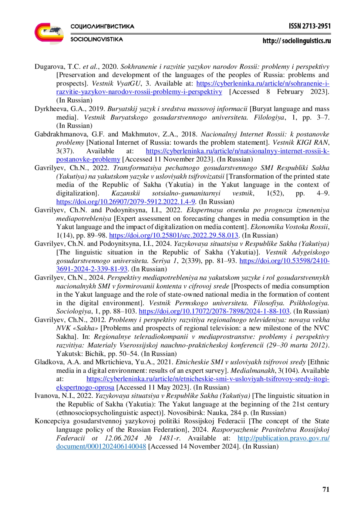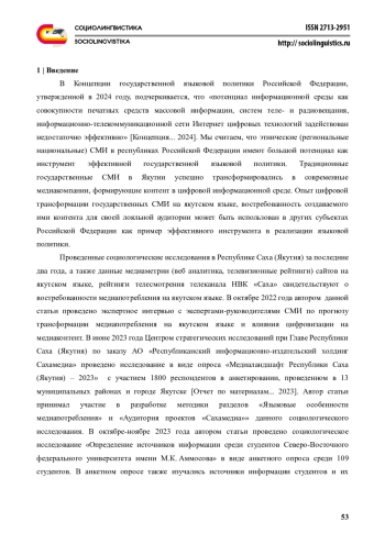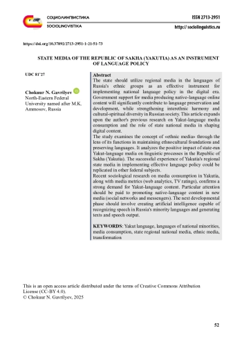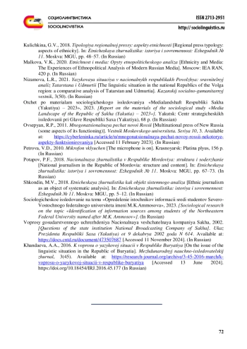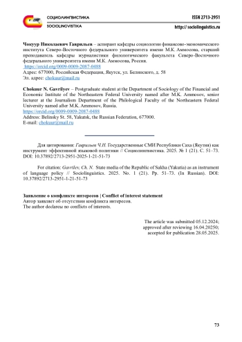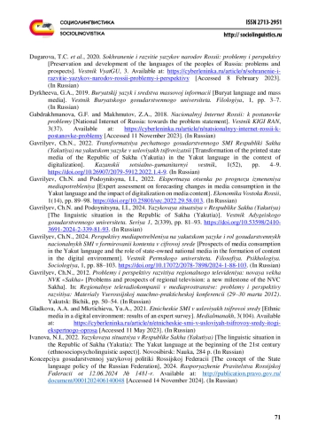 5. Гаврильев Ч.Н. (2024) Перспективы медиапотребления на якутском языке и роль государственных национальных СМИ в формировании контента в цифровой среде. Вестник Пермского университета. Философия. Психология. Социология. № 1. С. 88-103. EDN: KWKGDJ