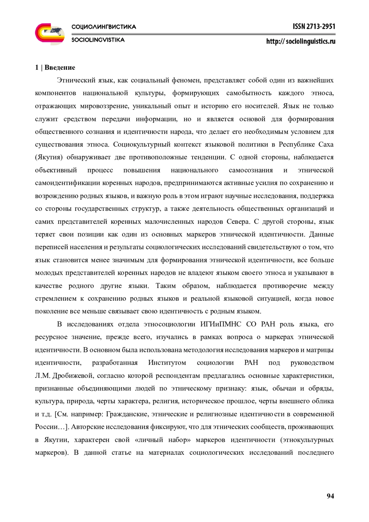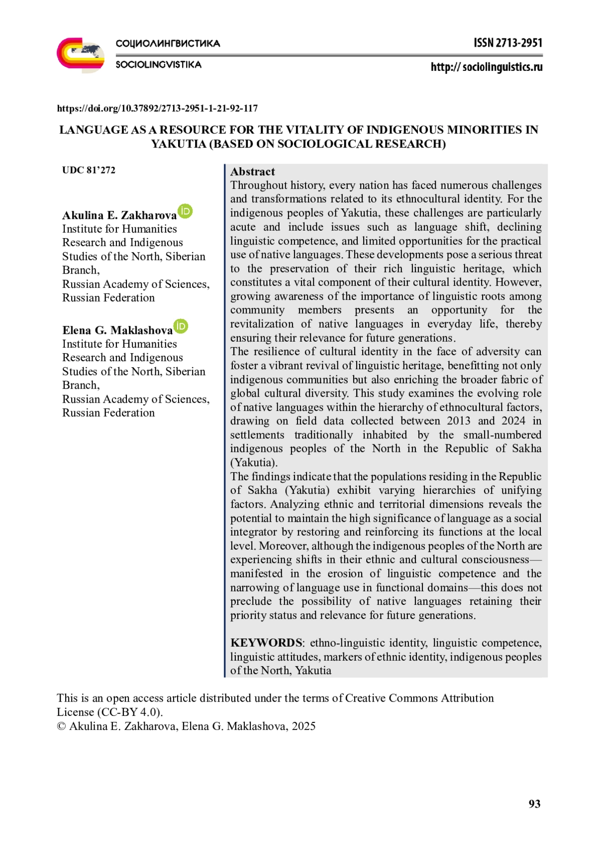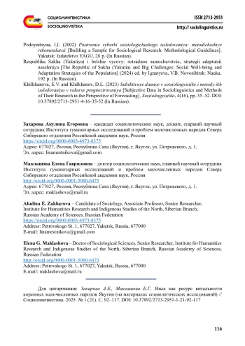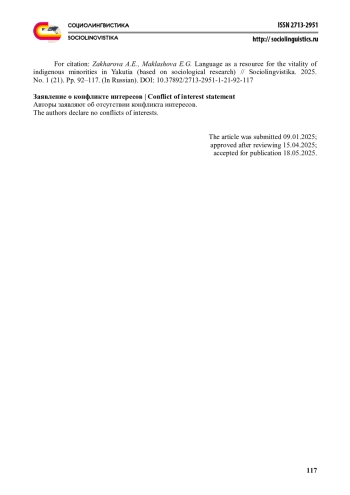 Каждый народ на протяжении своей истории сталкивается с различными вызовами и изменениями, связанными с трансформацией этнокультурной идентичности. Для коренных народов Якутии к таким вызовам относятся процессы языкового сдвига, утрата языковой компетенции, ограниченность объективных возможностей использования родных языков. Эти процессы могут угрожать сохранению языкового наследия, однако они не исключают возможности того, что родные языки все еще могут занять важное место в жизни будущих поколений. На основе данных полевых исследований, проведенных с 2013 по 2024 гг. в населенных пунктах Якутии, относящихся к местам традиционного проживания и традиционной хозяйственной деятельности коренных малочисленных народов Севера в Республике Саха (Якутия), выявлены особенности значения родного языка в структуре этнообразующих факторов. Определено, что у народов, проживающих в Республике Саха (Якутия), наблюдаются различия в восприятии объединяющих факторов (маркеров идентичности), а этнический и территориальный срезы позволяют сделать вывод о возможности сохранения высокого значения языка и его роли в обществе как объединяющего фактора за счет восстановления и укрепления его функций на локальных территориях. При этом установлено, что процессы трансформации этнического и культурного сознания коренных малочисленных народов Севера, а именно утрата языковой компетенции и сужение сфер функционального использования языков, не исключают приоритетные позиции родных языков в качестве потенциально востребованных для будущих поколений.